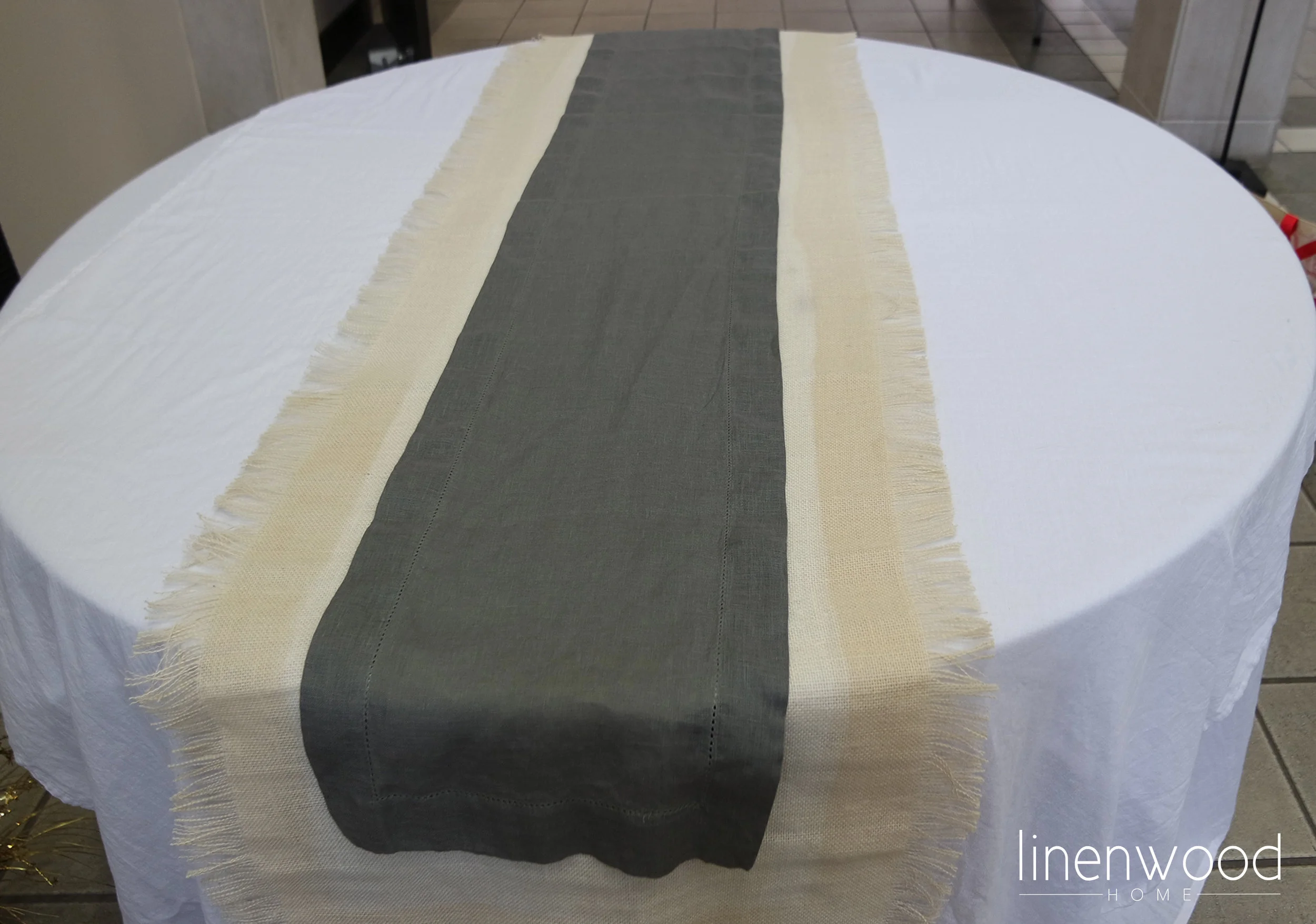 The first step is the base of the table. I love to use natural materials layered on top of each other. The table cloth is a flour sack material. I layered a jute fringed table runner on top of that for some natural softness. To provide contrast, I placed a dark grey linen table runner with subtle stitching details on the top.