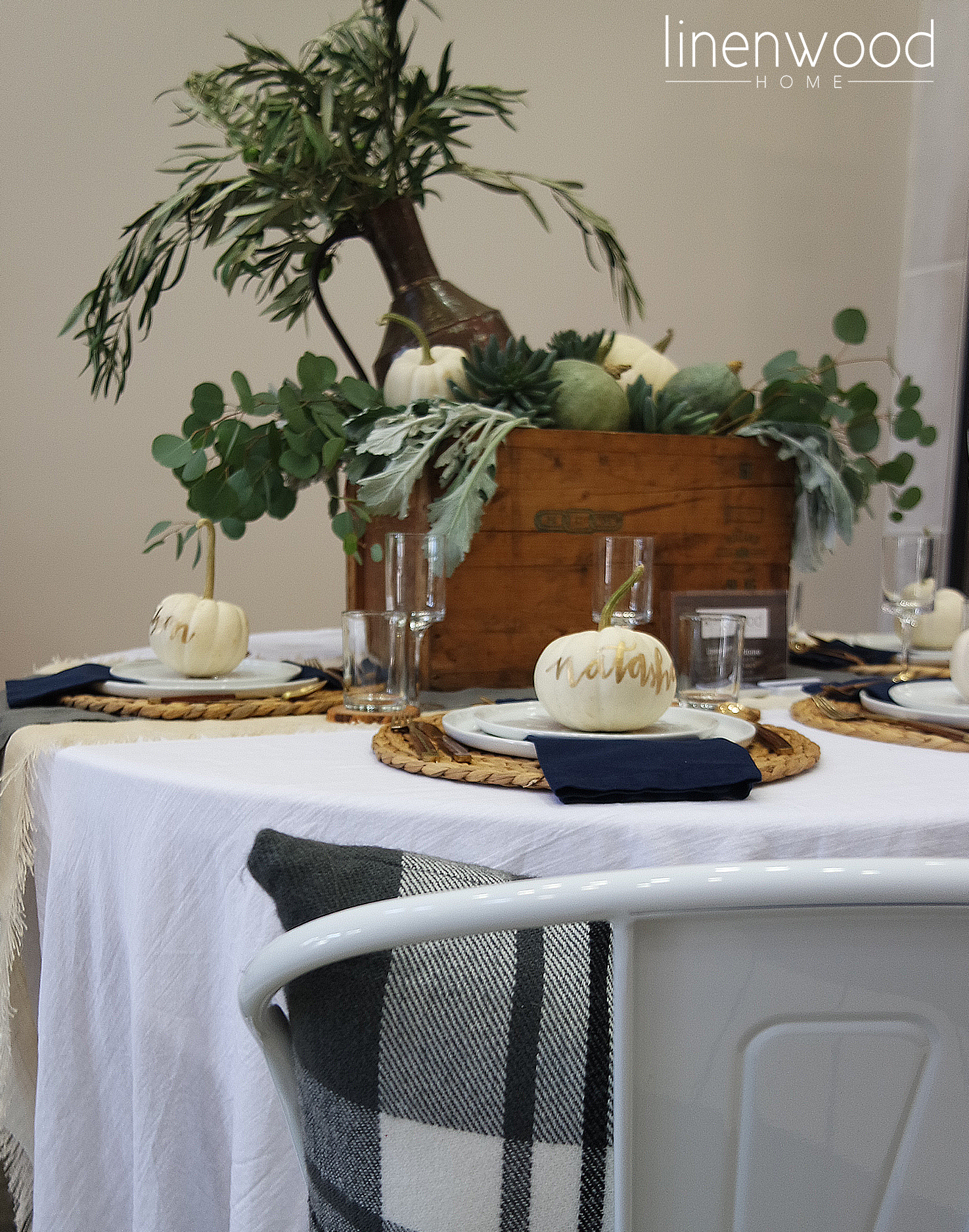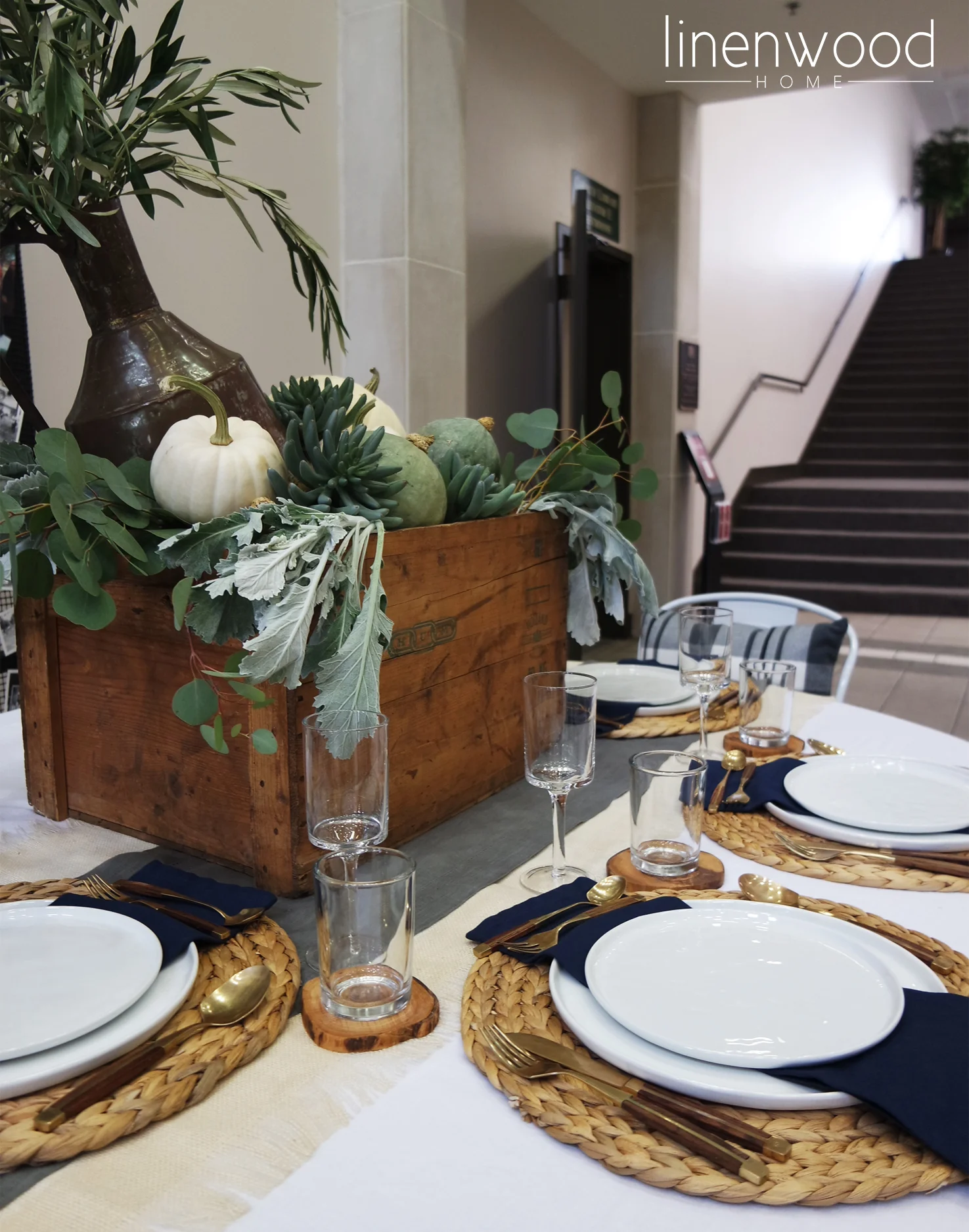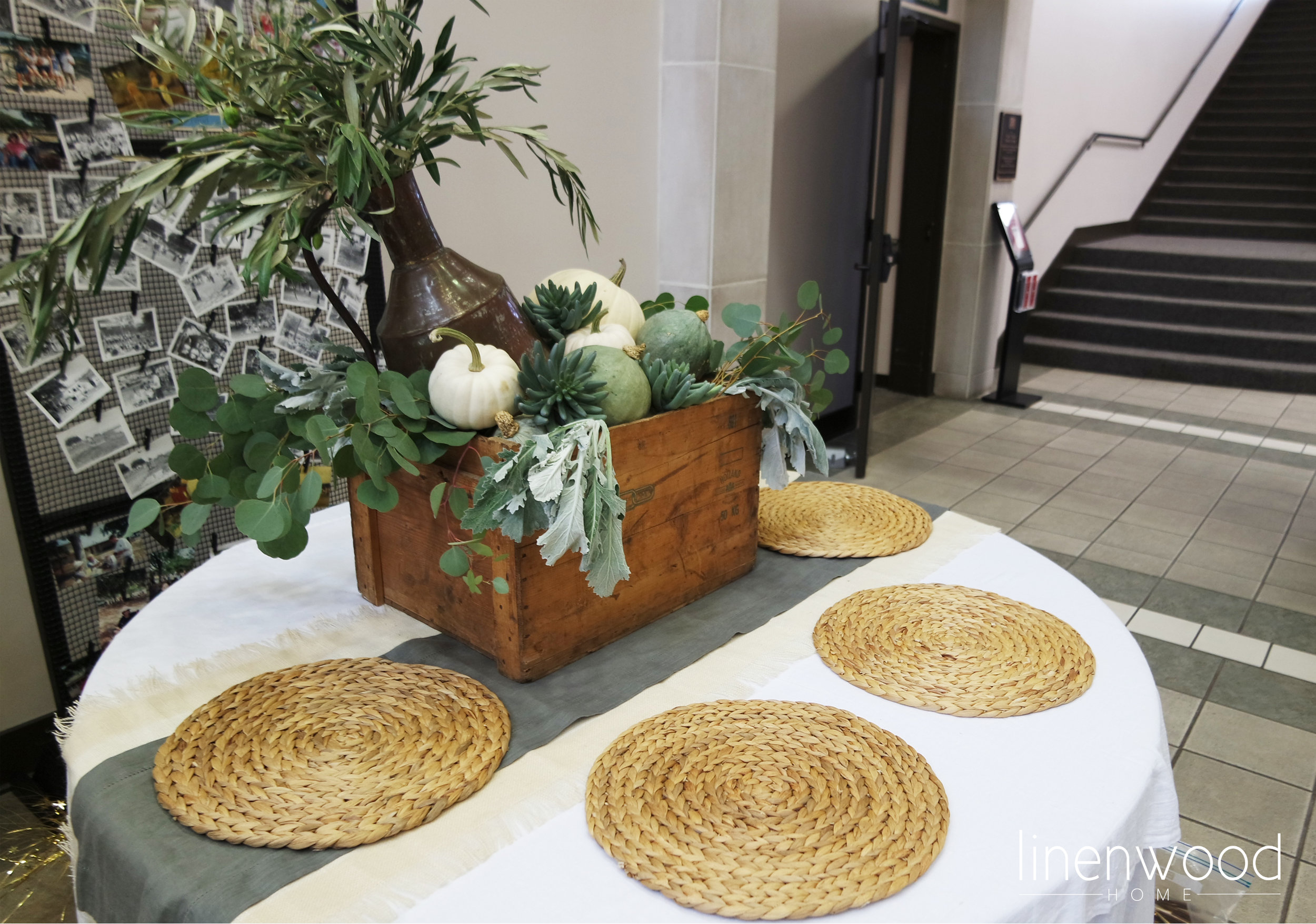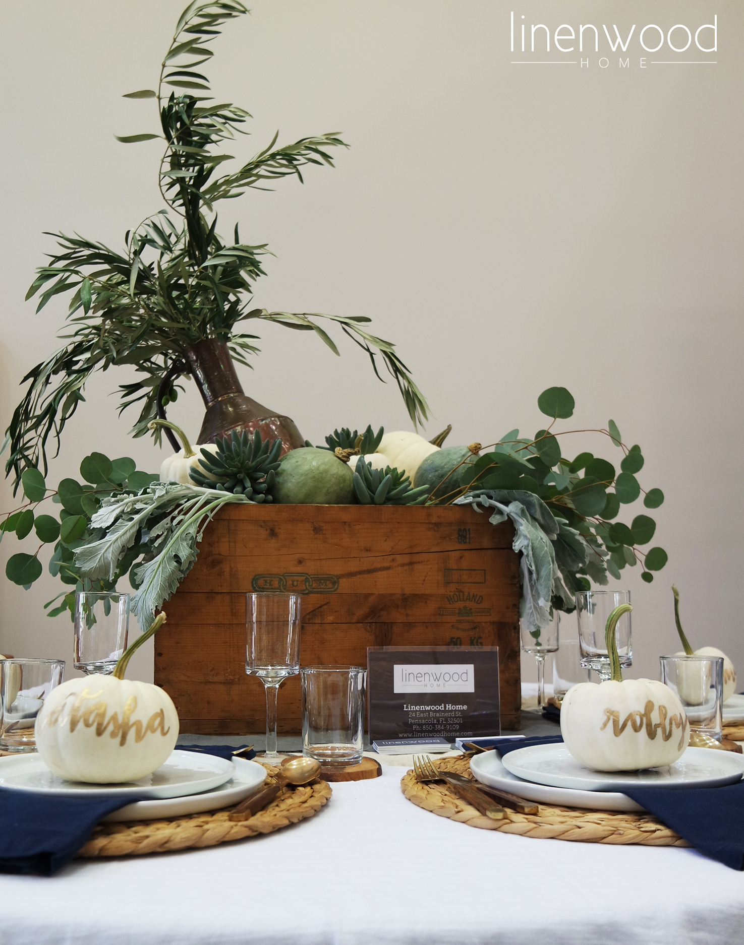 The centerpiece started with a vintage shipping crate I found at an antique store. I love the height of this crate, and it's versatility. I knew I wanted to incorporate a fall theme, so I piled in white pumpkins and sage colored squash. The antique copper pitcher gave me the height I wanted, and I generously filled it with fresh olive branches. To fill in the gaps between the pumpkins, I placed some faux succulents. This is the one kind of faux plant I am OK with since they look pretty real. To add another natural layer of color variations, I filled the remaining gaps in with fresh eucalyptus branches and silvery dusty miller. Not only does this centerpiece look good, it smelled so wonderful with all the eucalyptus branches!