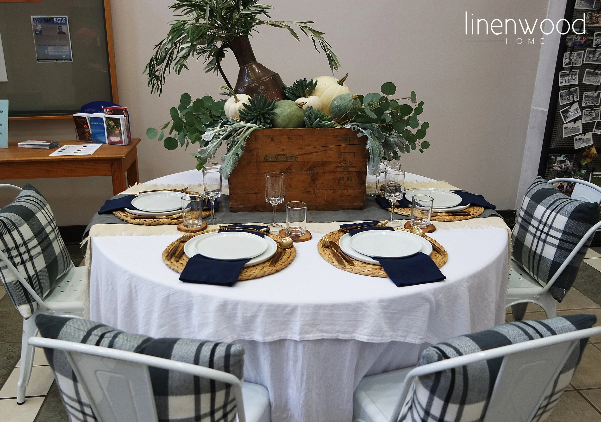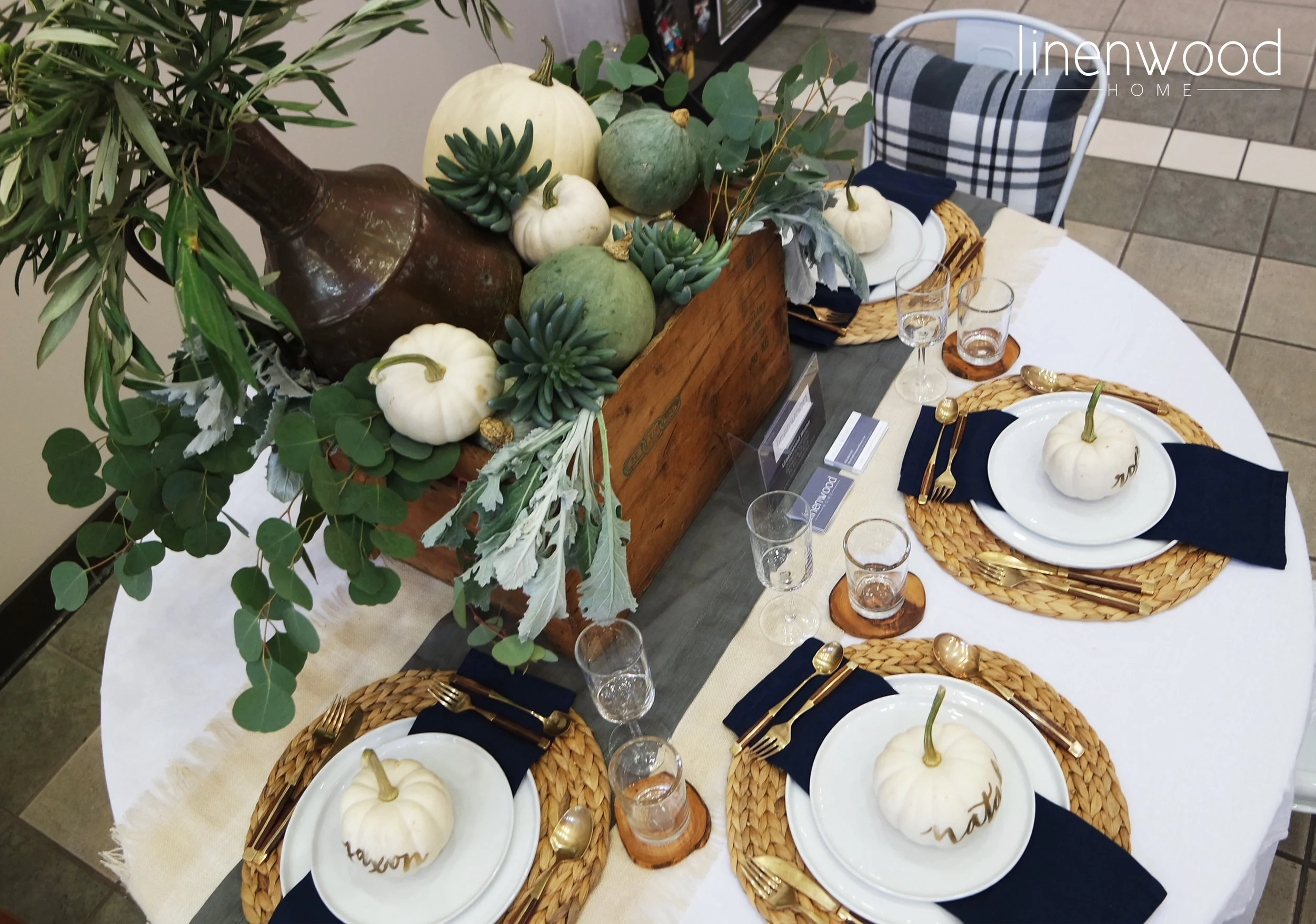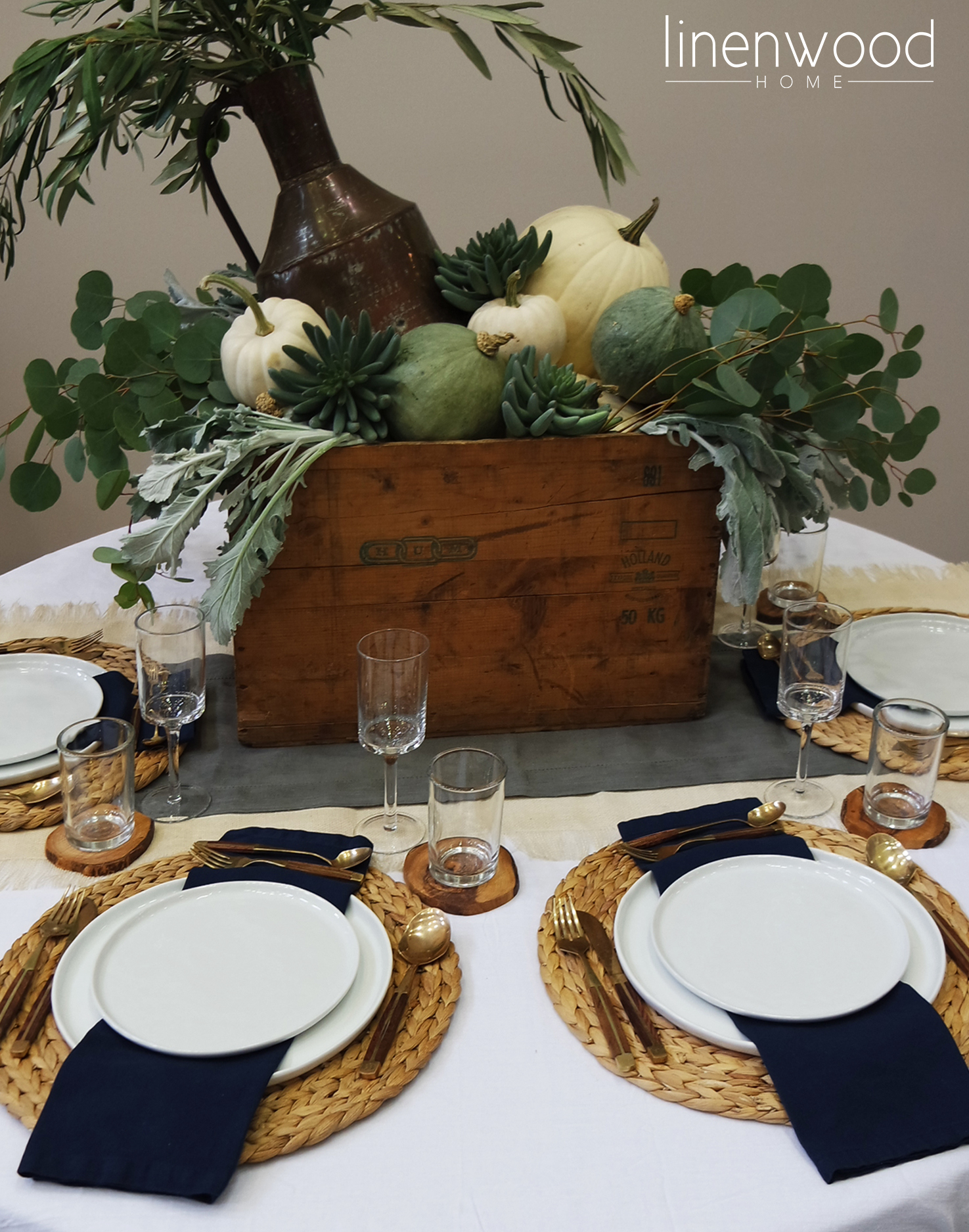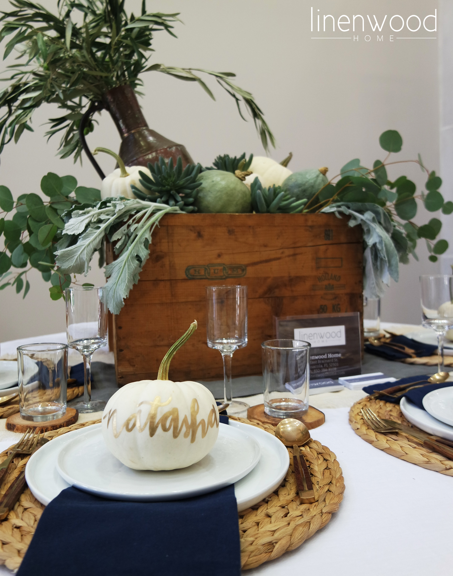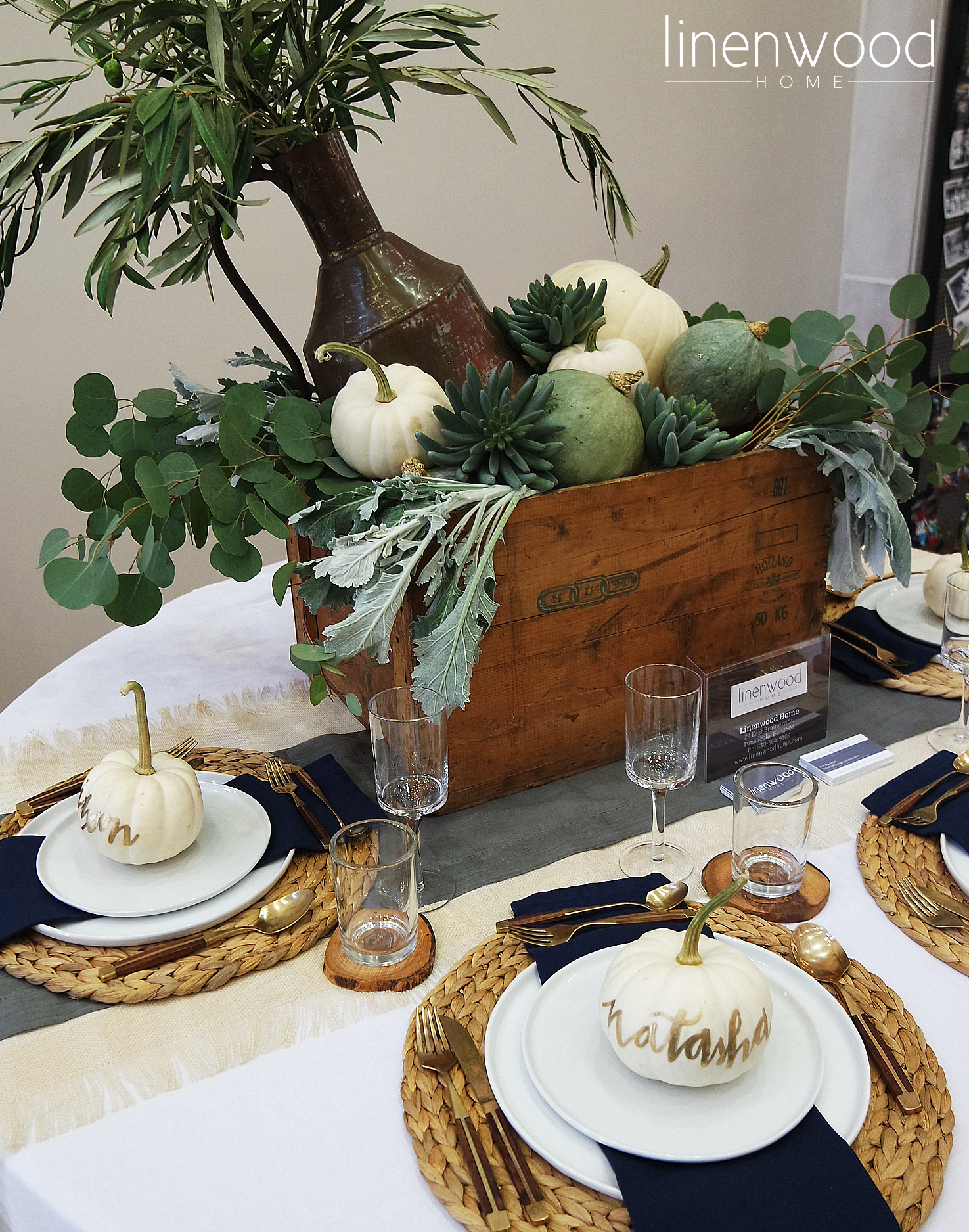 The centerpiece started with a vintage shipping crate I found at an antique store. I love the height of this crate, and it's versatility. I knew I wanted to incorporate a fall theme, so I piled in white pumpkins and sage colored squash. The antique copper pitcher gave me the height I wanted, and I generously filled it with fresh olive branches. To fill in the gaps between the pumpkins, I placed some faux succulents. This is the one kind of faux plant I am OK with since they look pretty real. To add another natural layer of color variations, I filled the remaining gaps in with fresh eucalyptus branches and silvery dusty miller. Not only does this centerpiece look good, it smelled so wonderful with all the eucalyptus branches!
