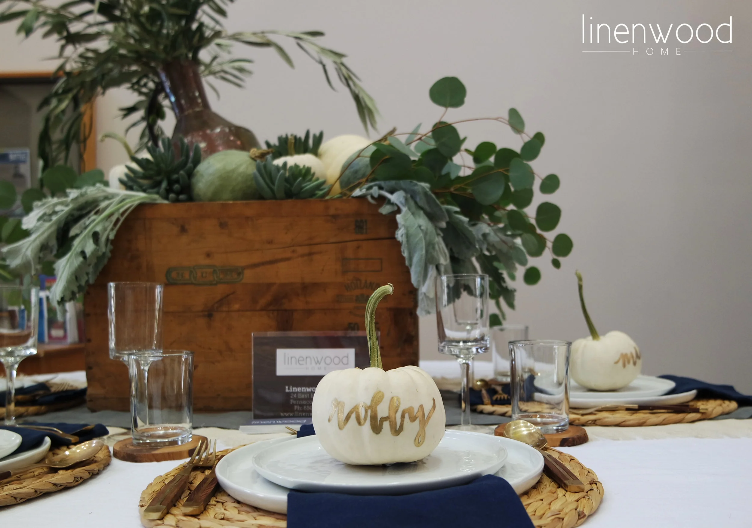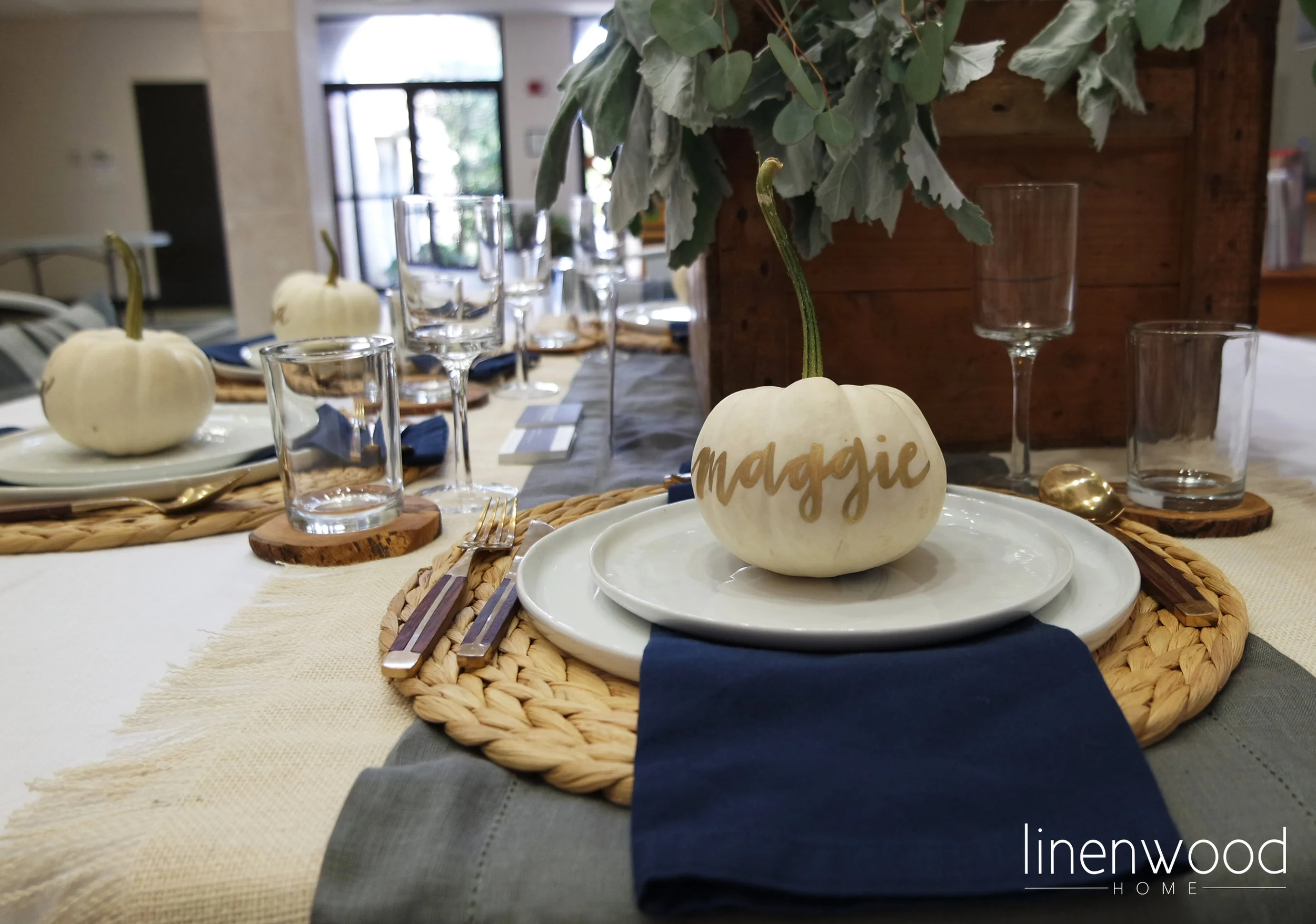 White pumpkins with the names of your guests will surely be a hit for your fall gatherings! Here are a couple more up close shots of the table - ENJOY!
