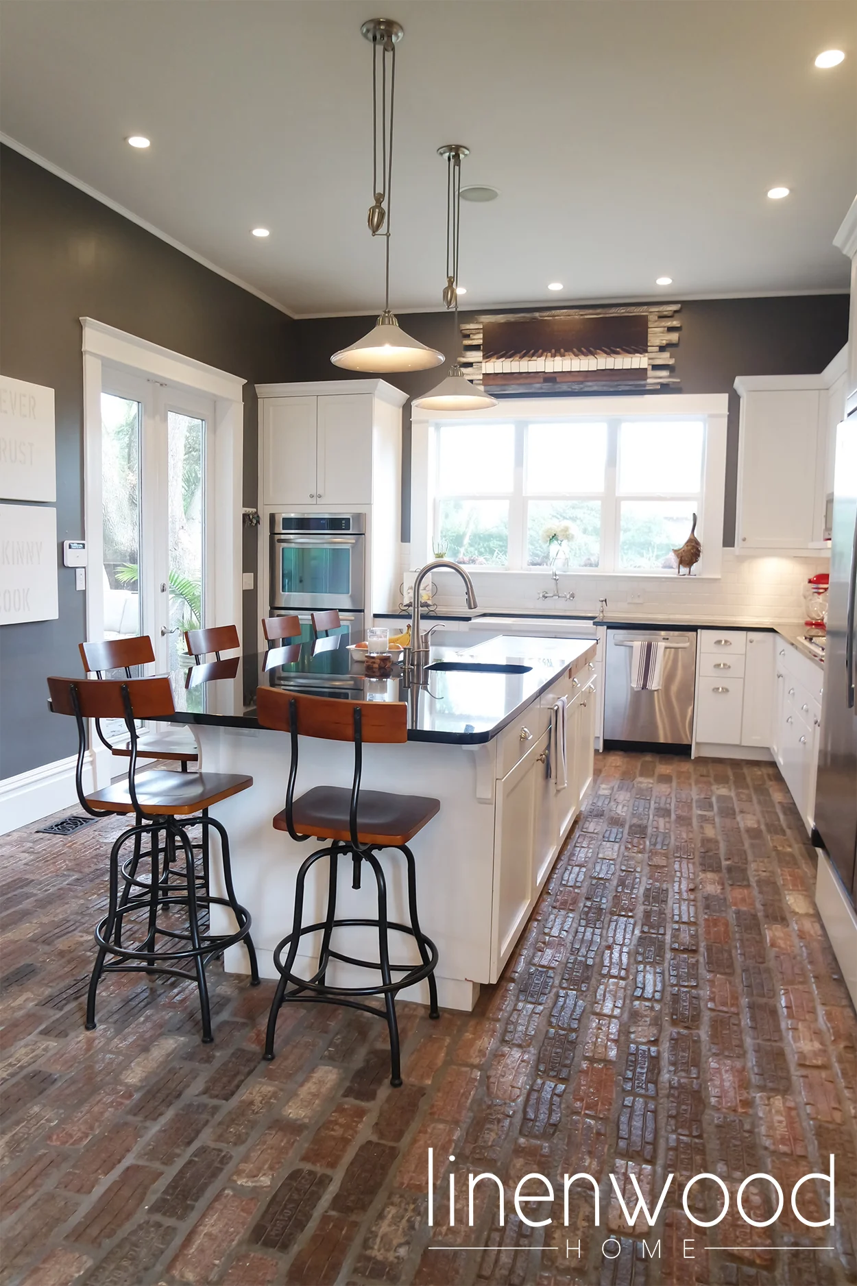 The back wall of the house actually separated from the house during Hurricane Ivan, so adding on the kitchen addition helped with structural issues as well. I had always wanted brick floors in my kitchen, so when our landscaper told us he had some actual antique road pavers from Indiana, we jumped on the opportunity to use them. They give the kitchen depth and provide great texture. No to mention, they are always a great conversation piece!