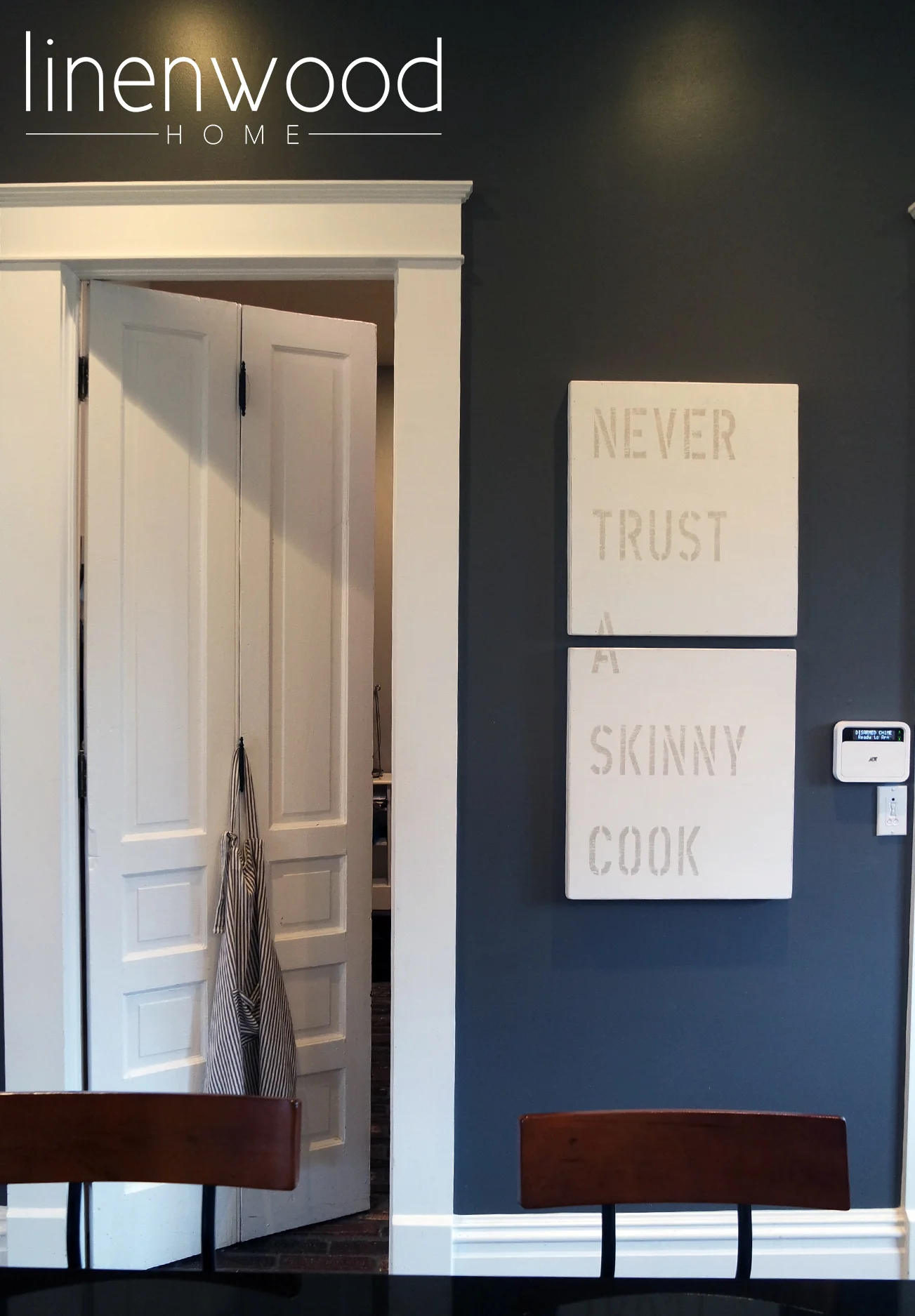 I played around with all different colors in the kitchen. I ended up choosing a very dark grey because everything else is so white. I just love using dark wall colors when you can, and this was the perfect instance. {I'm dying to paint some room in our house black}