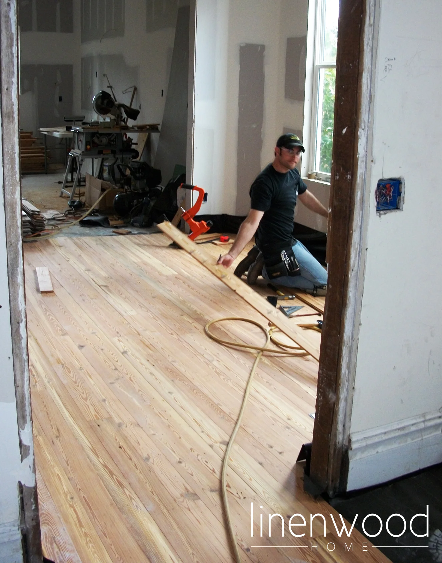 So we had to figure out a plan B, which happens quite a lot in these 100 year old homes we were finding out. I didn't want three different kinds of flooring in our downstairs living area, as I thought it would completely ruin the flow. We already decided on brick in the kitchen and I knew I didn't want brick in the dining room too. Tile would have looked out of place and trying to cover just the dining room wood flooring with more wood would look silly. So, we made the decision to lay all new wood floors in the entire downstairs to make it uniform. Easy, no problem, right? Sure, if someone else was laying them. But to stay on budget, we decided to take on the task.