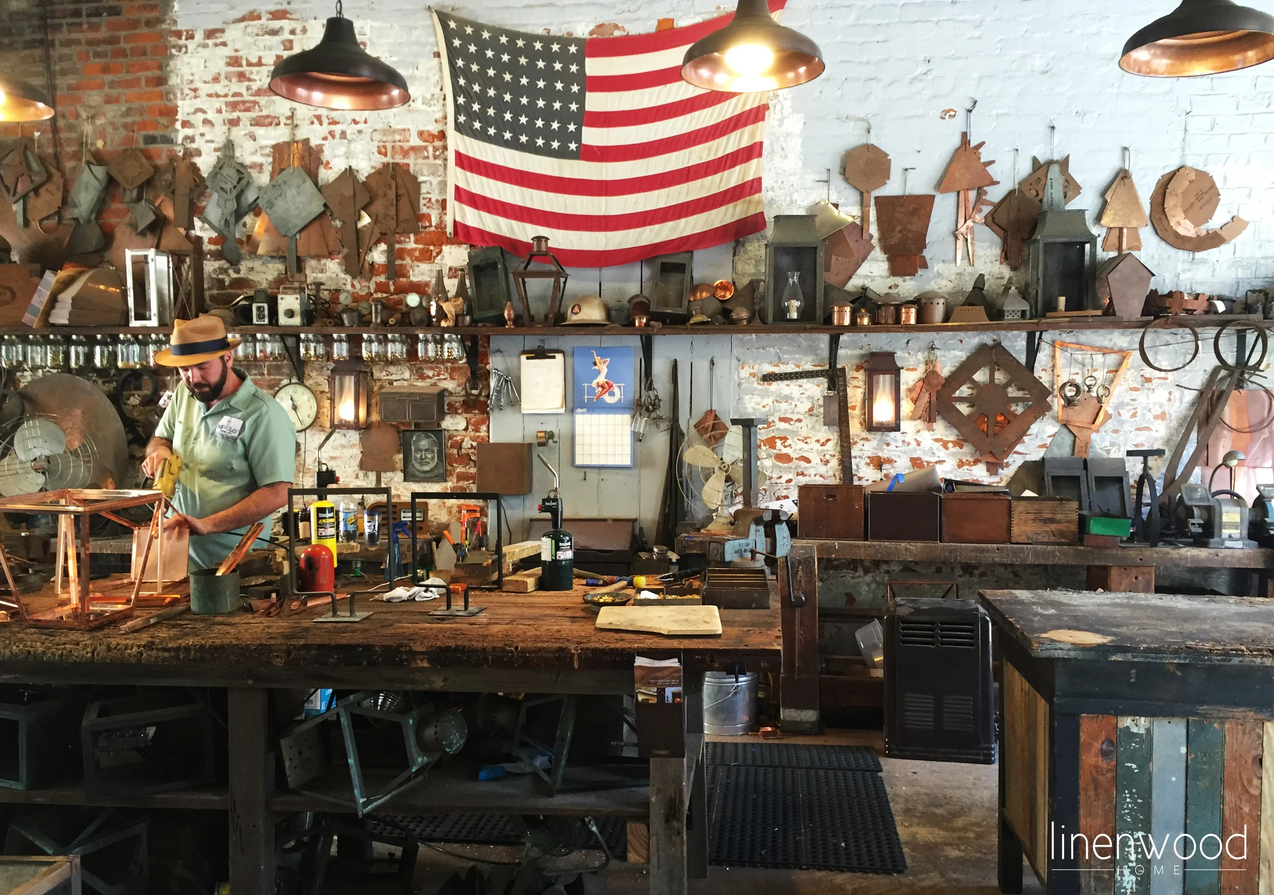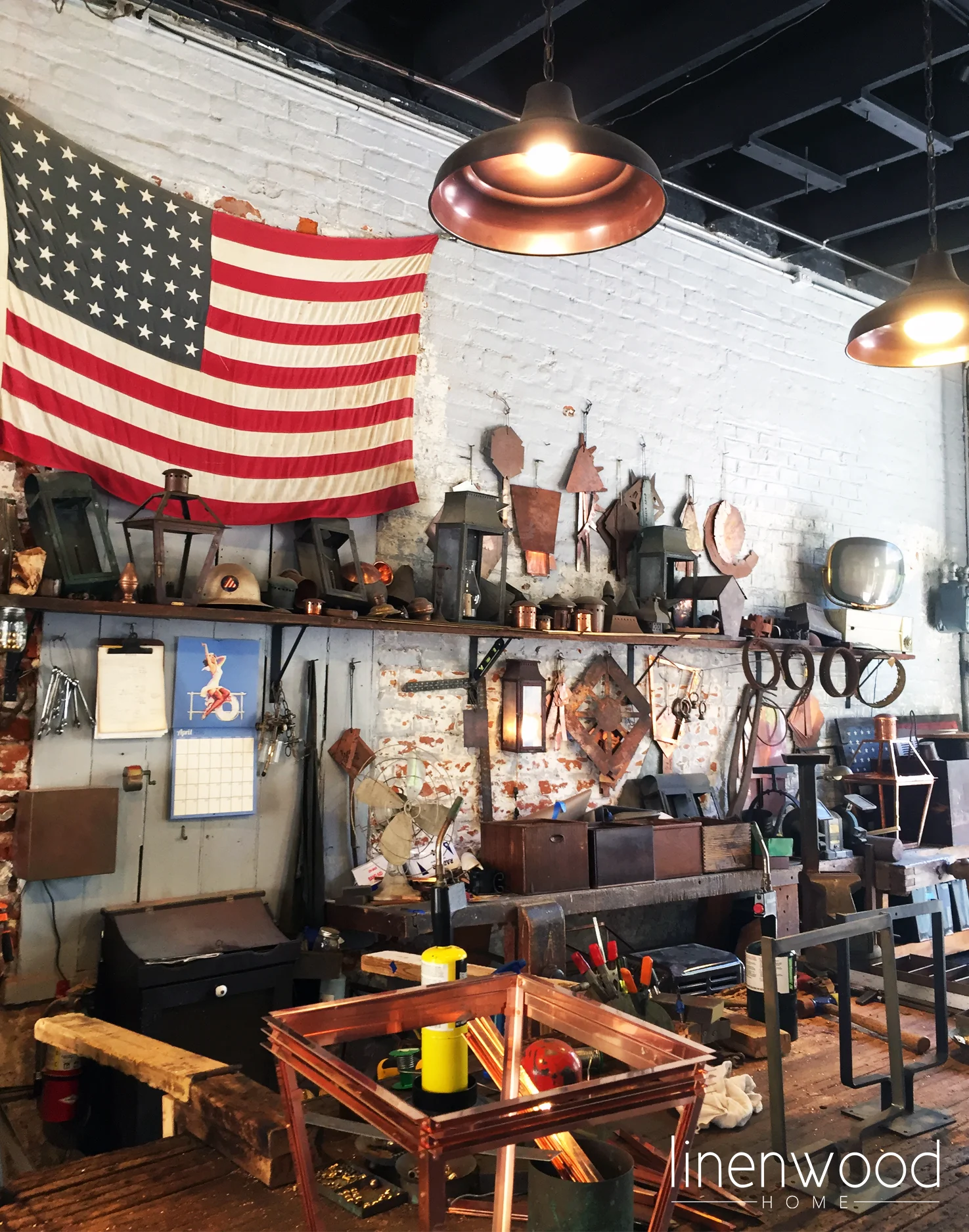 We walked into this beautiful and bright courtyard area, and what we found next was fantastic!! The workshop. This is where we had the pleasure of meeting Nate - a young and very talented coppersmith. He was actually working away, hand riveting lanterns, and it was so wonderful to watch! I'll let the pictures do the talking {please take a moment to look at his work space - I have no words - it is SO GOOD!}.