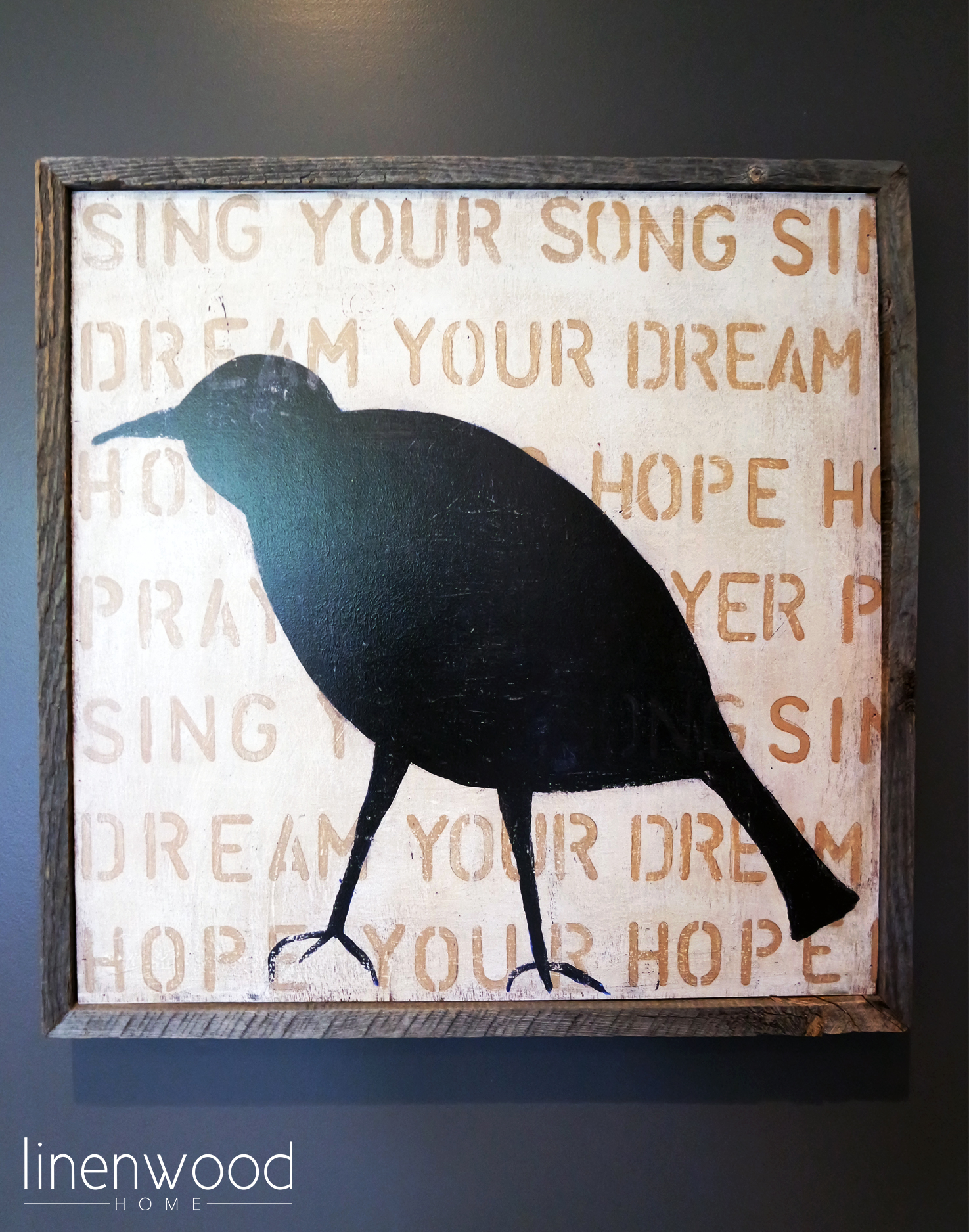 This wooden black bird painting is by Sugarboo Designs, and I found it at Duh. There was just something about it that spoke to me and I had to have it. Plus it was on sale, and I can't pass up a good deal. I initially bought it to place in my son's nursery. Call me superstitious, but it didn't quite feel right putting a black bird in a baby's room. So it found a perfect home in our kitchen.
