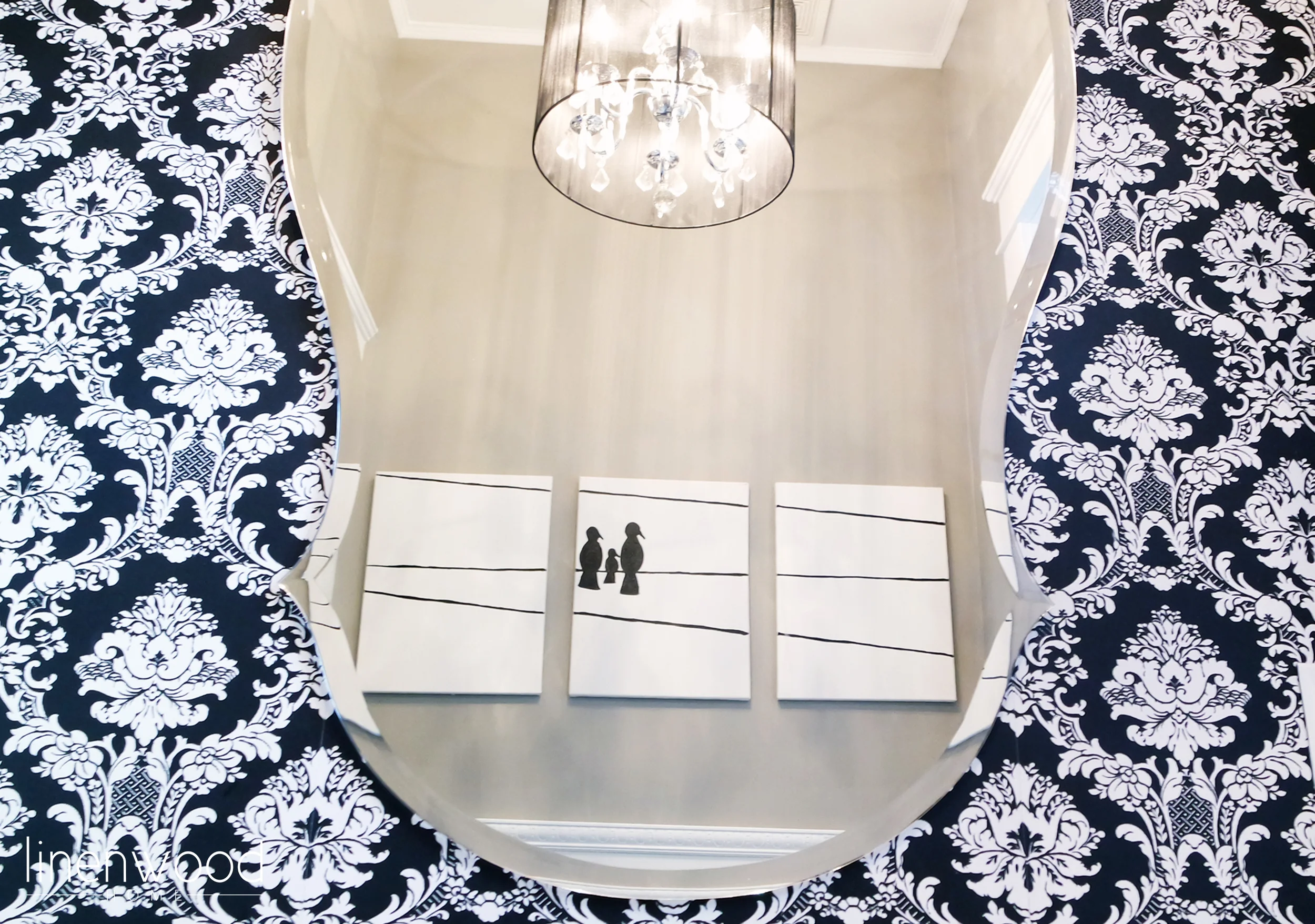 The Sugarboo art must have inspired me, because I created this triptych work of art for our downstairs powder room. I'll be honest, I needed something to put on this wall because we were having a huge party for a friend, and I hate having unfinished rooms. I literally painted this in about 30 minutes and it was meant to be temporary. I painted it to represent my sweet little family of three, and I just love it so much that it hasn't moved since I first put it up.