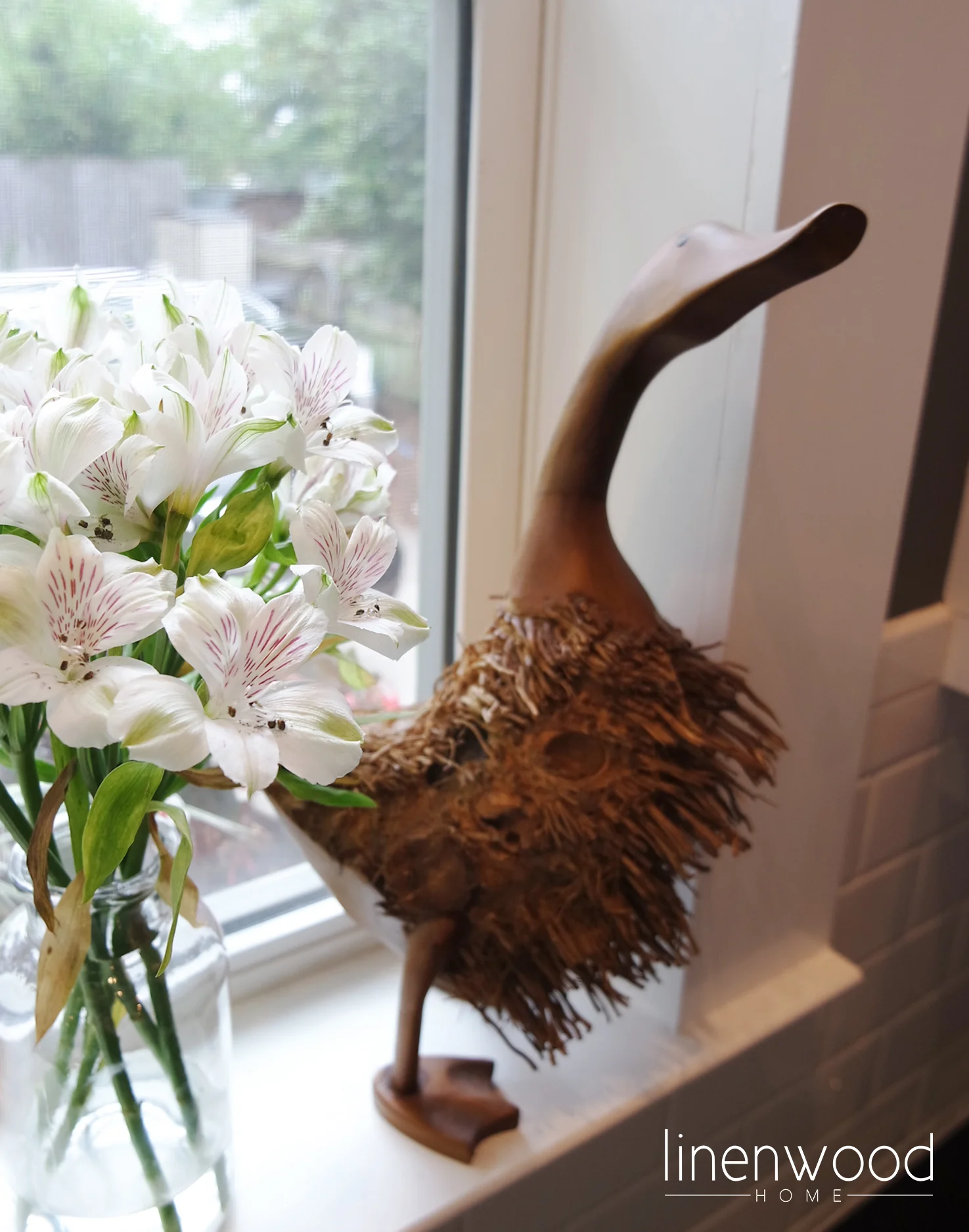 This cute little rough teak duck has a home in my kitchen window. Before we had our son, my husband and I took a trip down to the Florida Keys. We stayed at a resort on Duck Key. While we were doing a little shopping in Key West, I found this fun little guy and just had to have him. He will always remind us of our adventures on Duck Key.