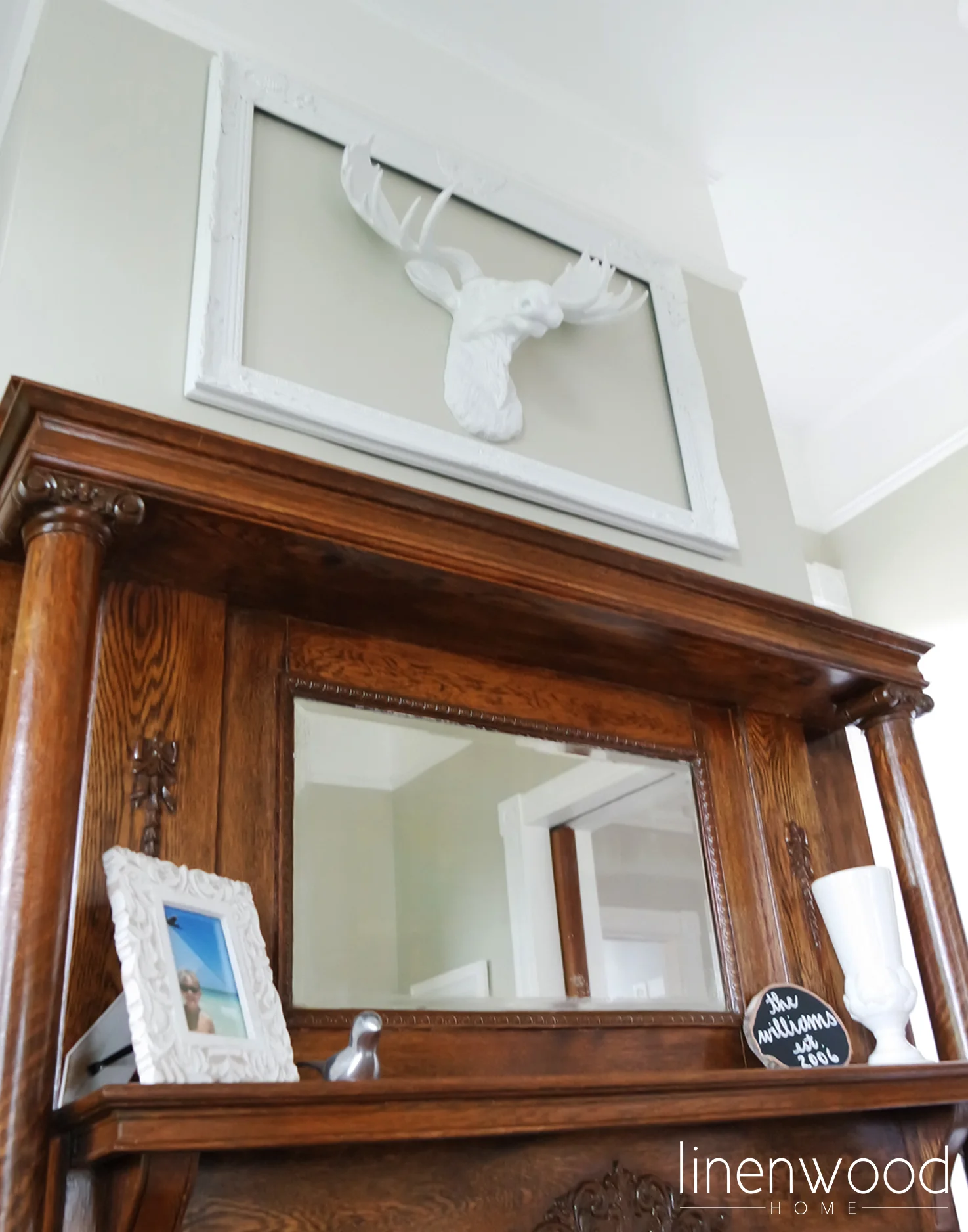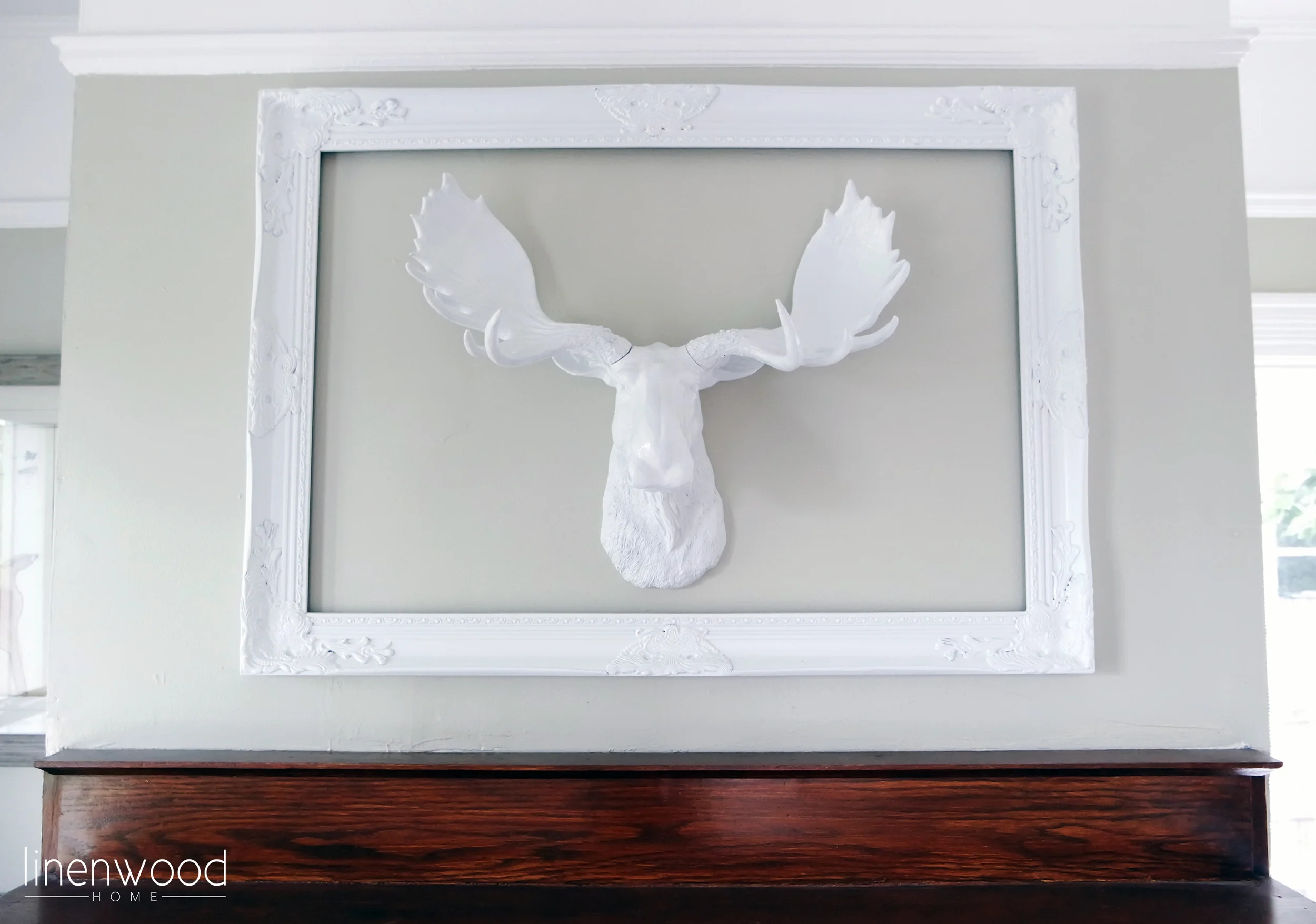 As you may have seen in my last blog post about my home office, I have this gorgeous white moose head. He looked so plain up there on his own, so I found an inexpensive decorative frame at Hobby Lobby, painted it glossy white, and now the moose is a work of art and a unique focal point in my office space.