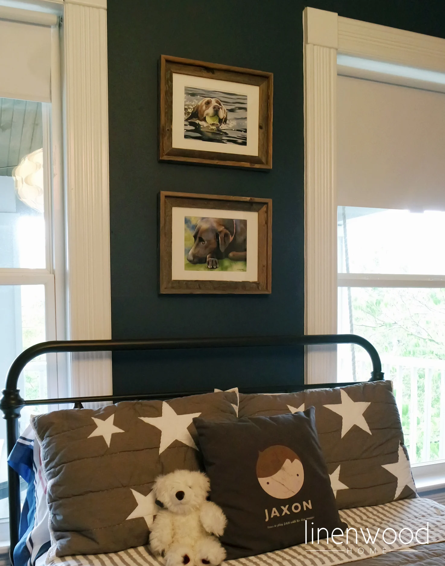 In my son's room, we found some great watercolor artwork of chocolate labs on Etsy. We just knew he would one day become best friends with our family chocolate lab, Maggie, so we wanted to incorporate dog art into his bedroom. And if you're wondering, yes, they are indeed the best of friends!