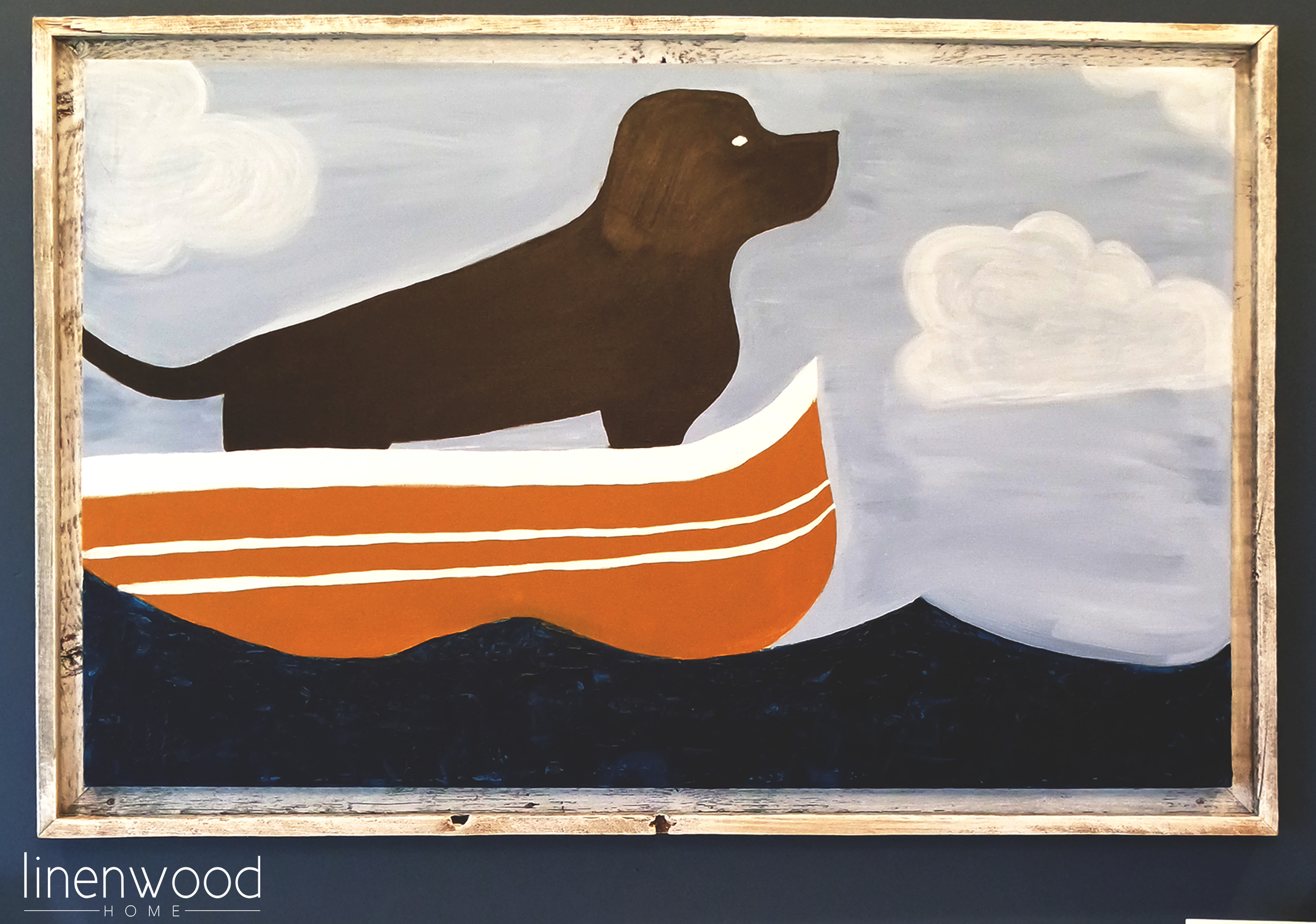 I kept my favorite animal piece for last, maybe because I created it. While I was pregnant, I painted this dog in a canoe for my son's room. I thought it would be a fun and whimsical touch for a little boy's room, and it's something he can keep forever. When we recently restyled his room, he specifically asked to keep it where it was. That makes me one happy mama.