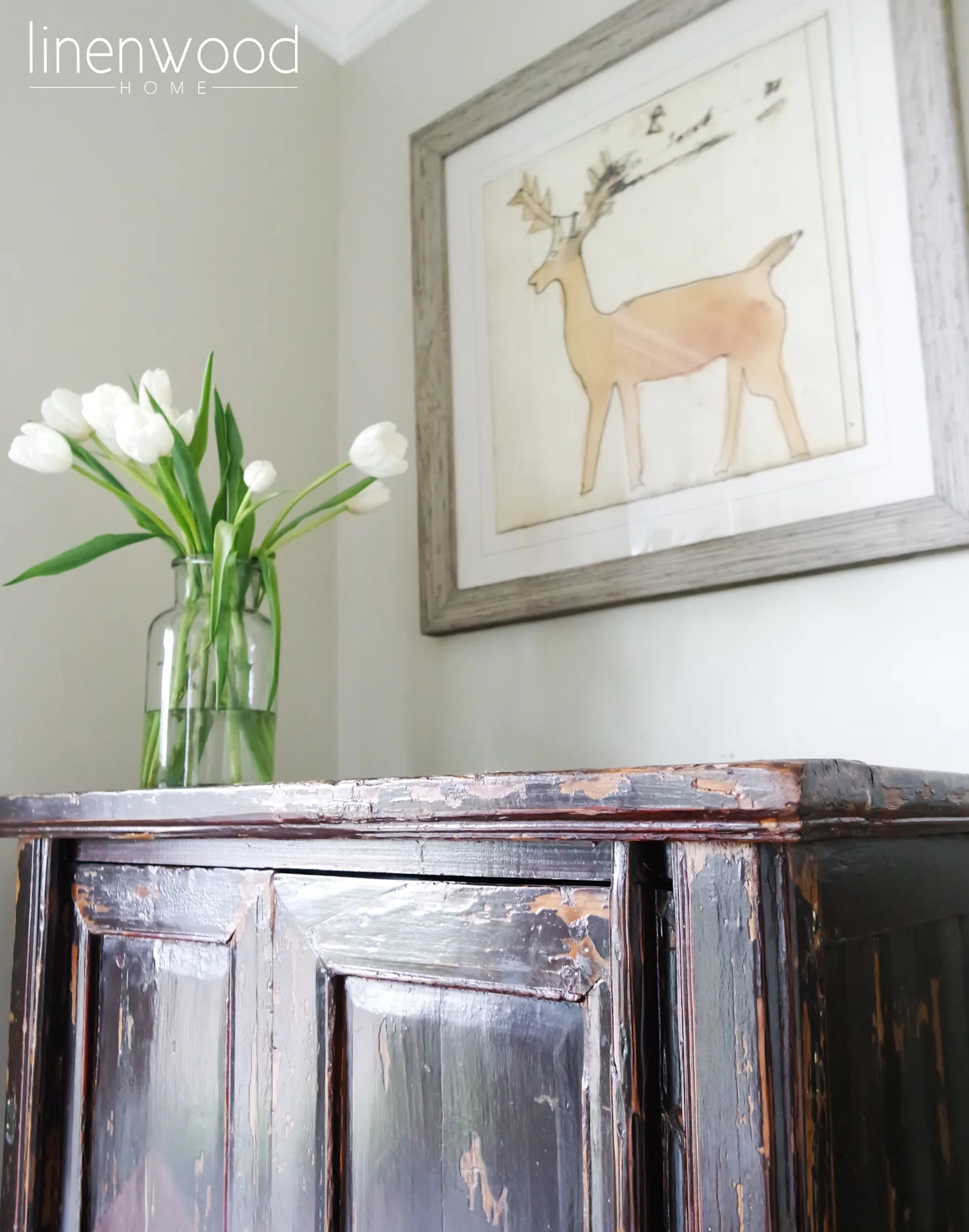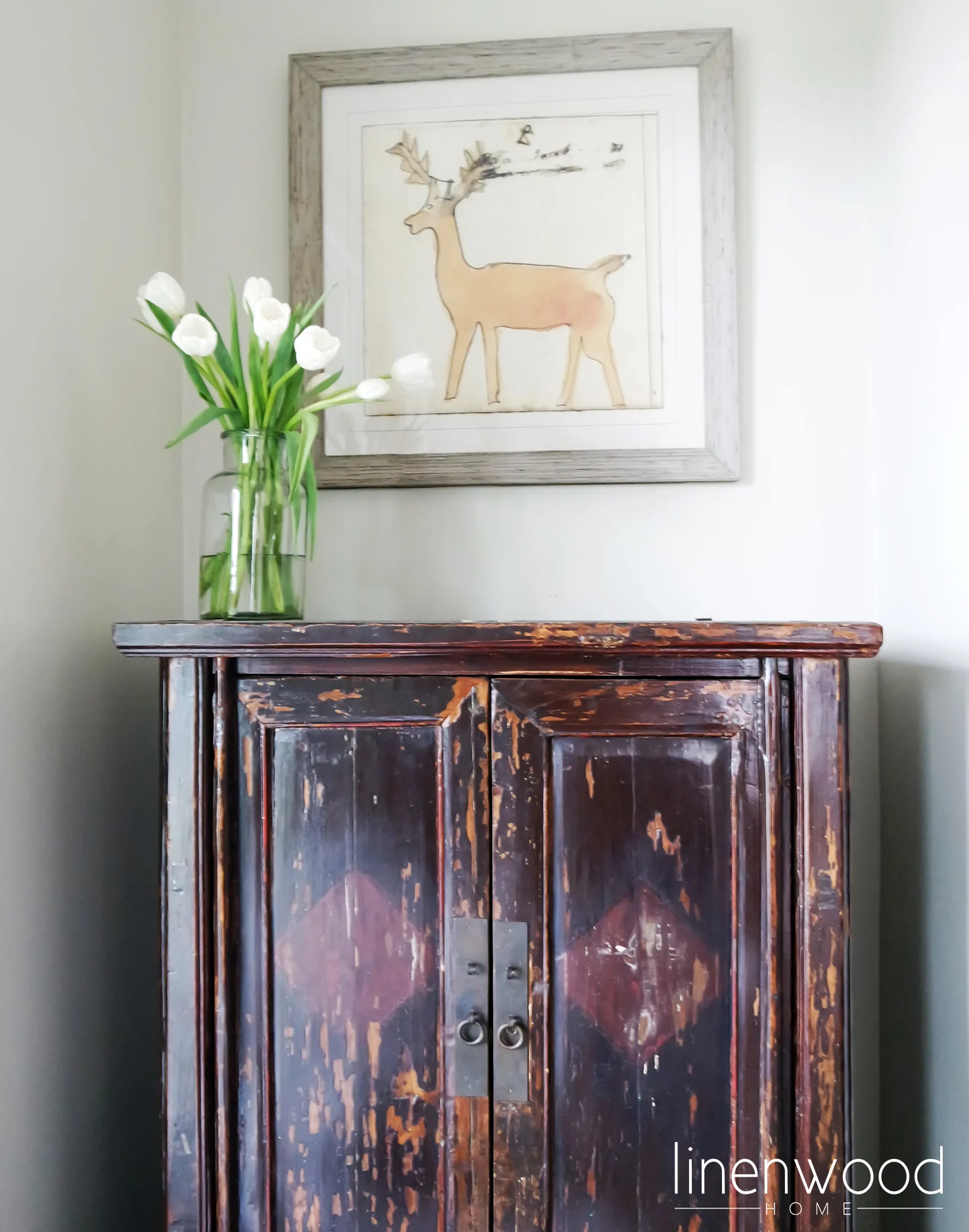 Also in my home office, I have this beautiful mennonite deer print. This again was a great sale find at Duh. I sometimes catch our sneaky elf putting a little red dot on his nose during the holidays, so he magically turns into Rudolph! My son loves it!