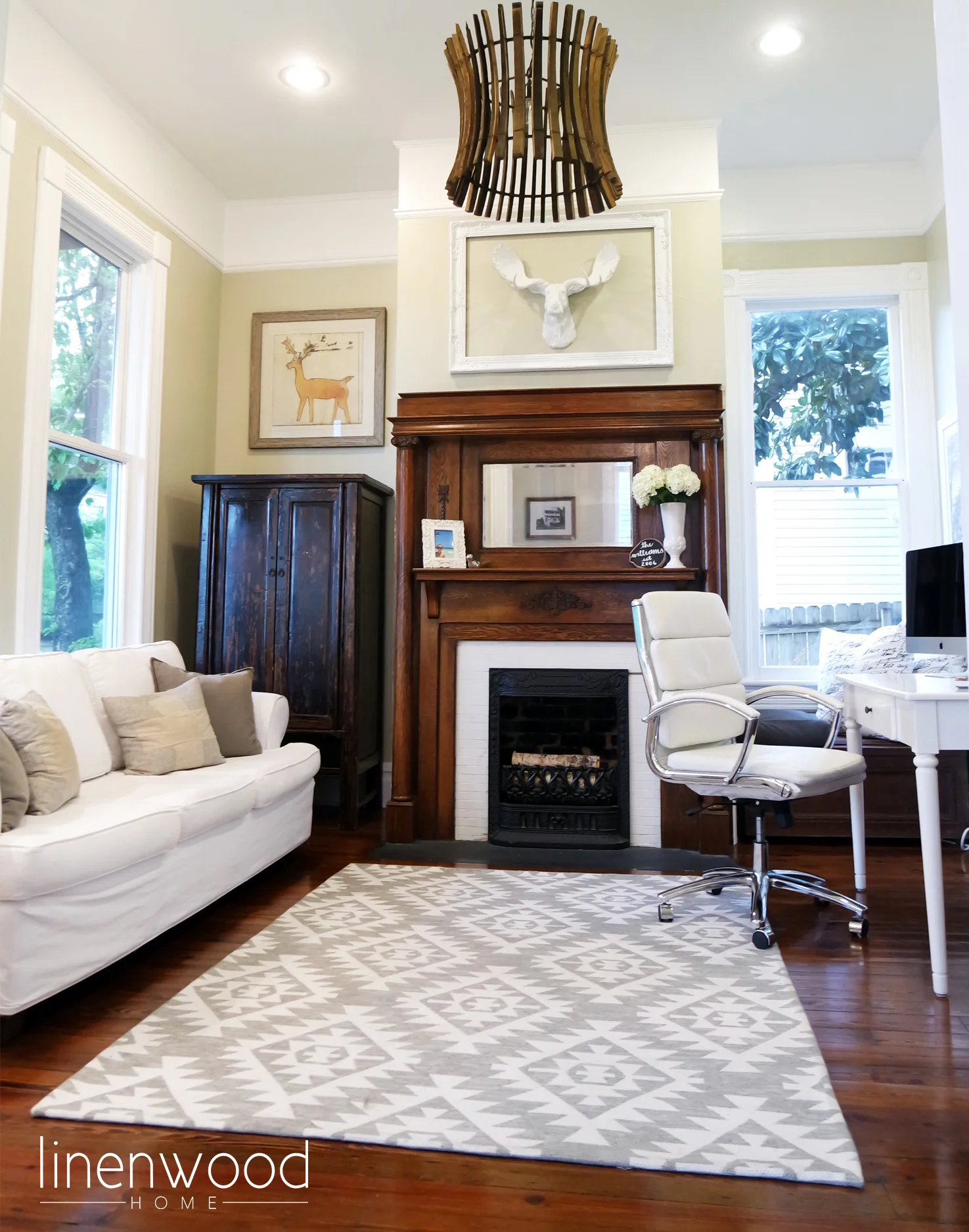 I had to brighten the space because of the two large wood pieces in the room - the fireplace and the antique cabinet. So I added our white sofa, a white desk and chair, and a great aztec print rug from Target. I found the wine barrel chandelier from DUH as well. It's more wood, but I just had to have it, and I think it ties into the fireplace very well.