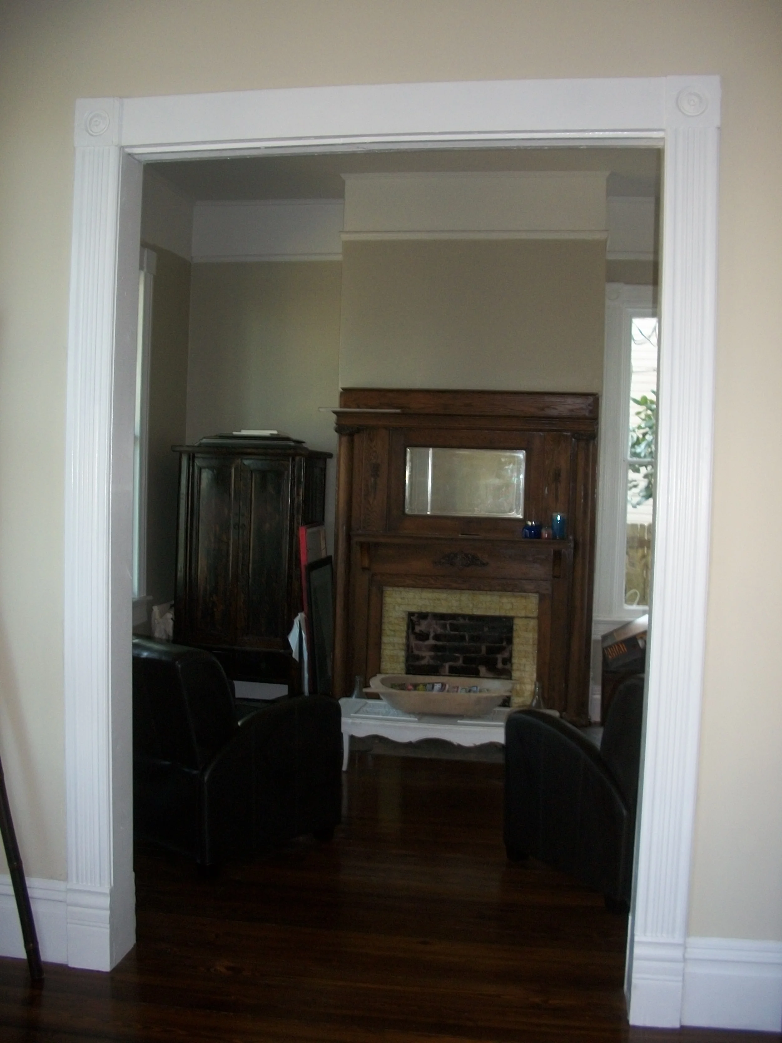 When we first bought the house, the fireplace had white paint lathered all over it. Taking off this paint was one of the most time consuming projects we undertook while renovating The Brainerd Street House. The fireplace tile was a horrible yellow/green color, which I finally painted over. Here are some before pictures of what this room once was. You can see the beautiful pocket doors that connect this room to the living room.