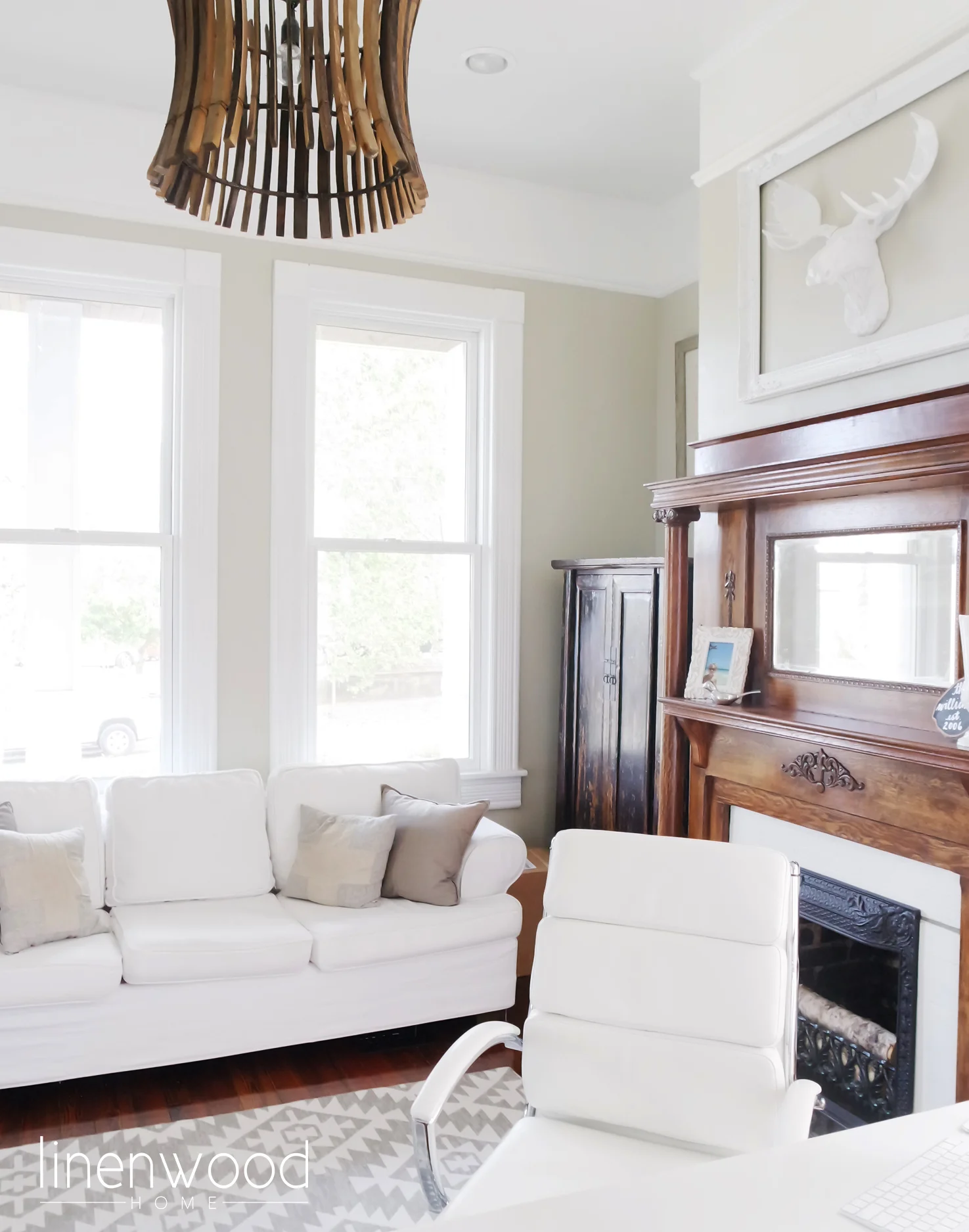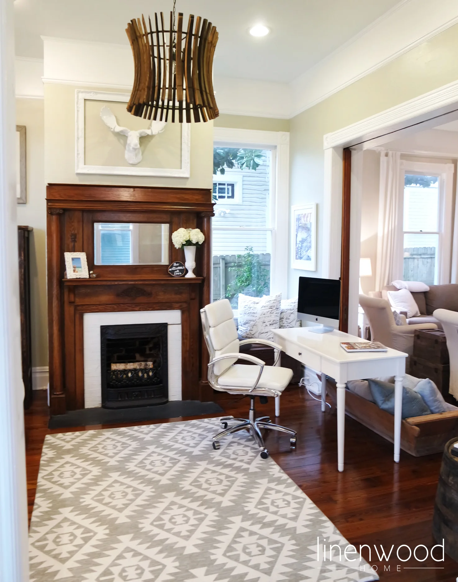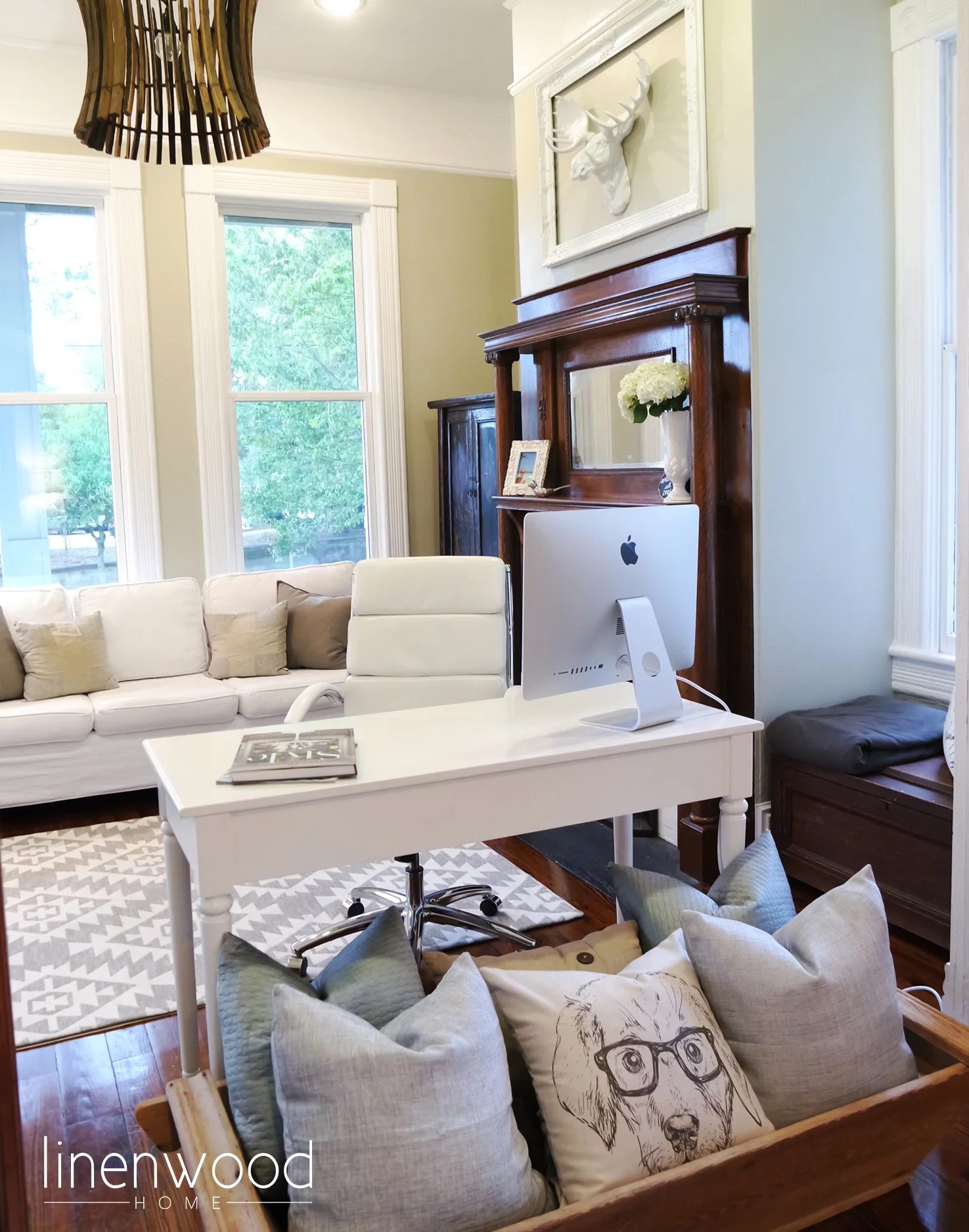 I had also bought the piece to the left of the fireplace from a local store, DUH for Garden and Home. It is an antique piece from China and housed our liquor at our previous home, and I didn't want to just get rid of it. I'm glad I didn't because now it's home to paint color books and all of my files. As you can see, the front room of our house has gone under quite a transformation. Now, as my home office, it's bright, light and airy. It's the perfect space to tell my story and create beautiful spaces for other people to live in. Here are a few more images of my home office now.