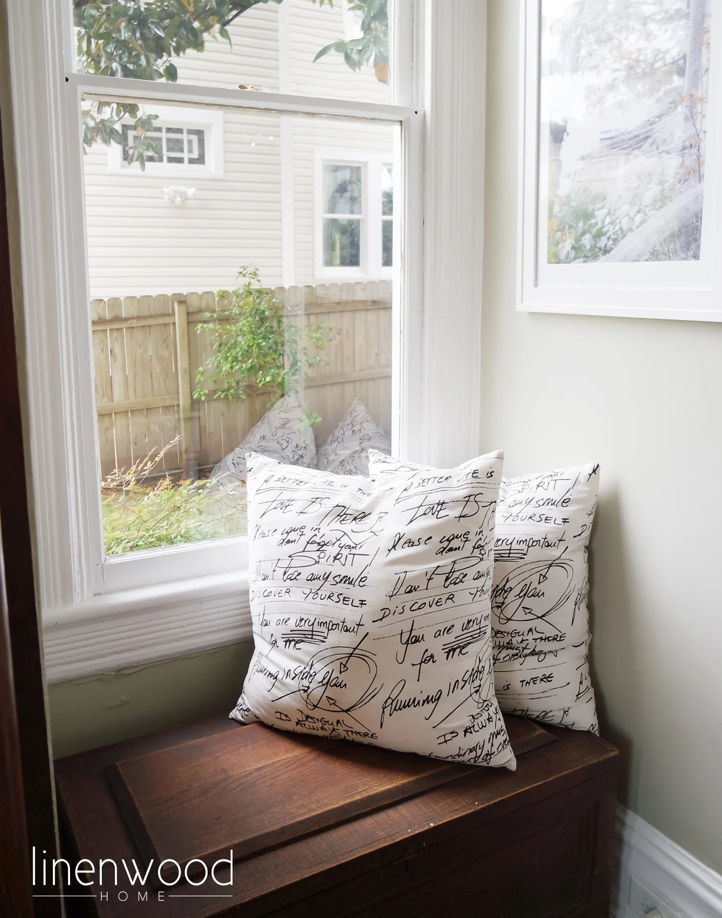 In the inglenook area, next to the fireplace, there is my husband's grandfather's old trunk that I threw some oversized pillows on. It's a great place for my son to sit and look outside, or let's be honest, to play on the iPad.