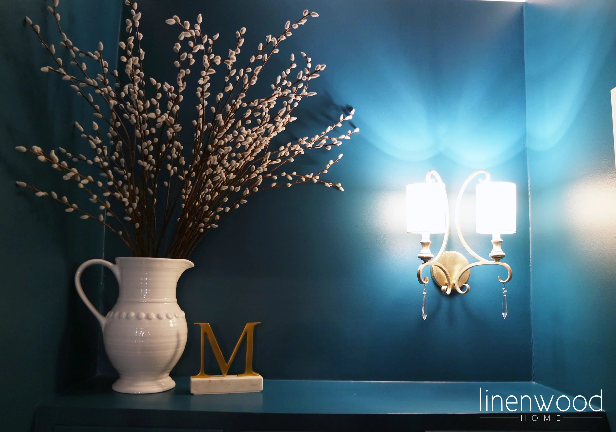 The main focus in this room was to tie it all together and finish it, but also brighten the lower half since the paint color is on the darker side. After debating over what to do on the large open wall, we decided upon mirrored frames instead of a gallery wall of mirrors. While a great idea, I think too many mirrors would have overpowered the room. We also had to dress up a shelf in the space, and I wanted to add something light here. I found a gorgeous beaded white pottery pitcher and we added some willow branches for height. Here's the finished product.