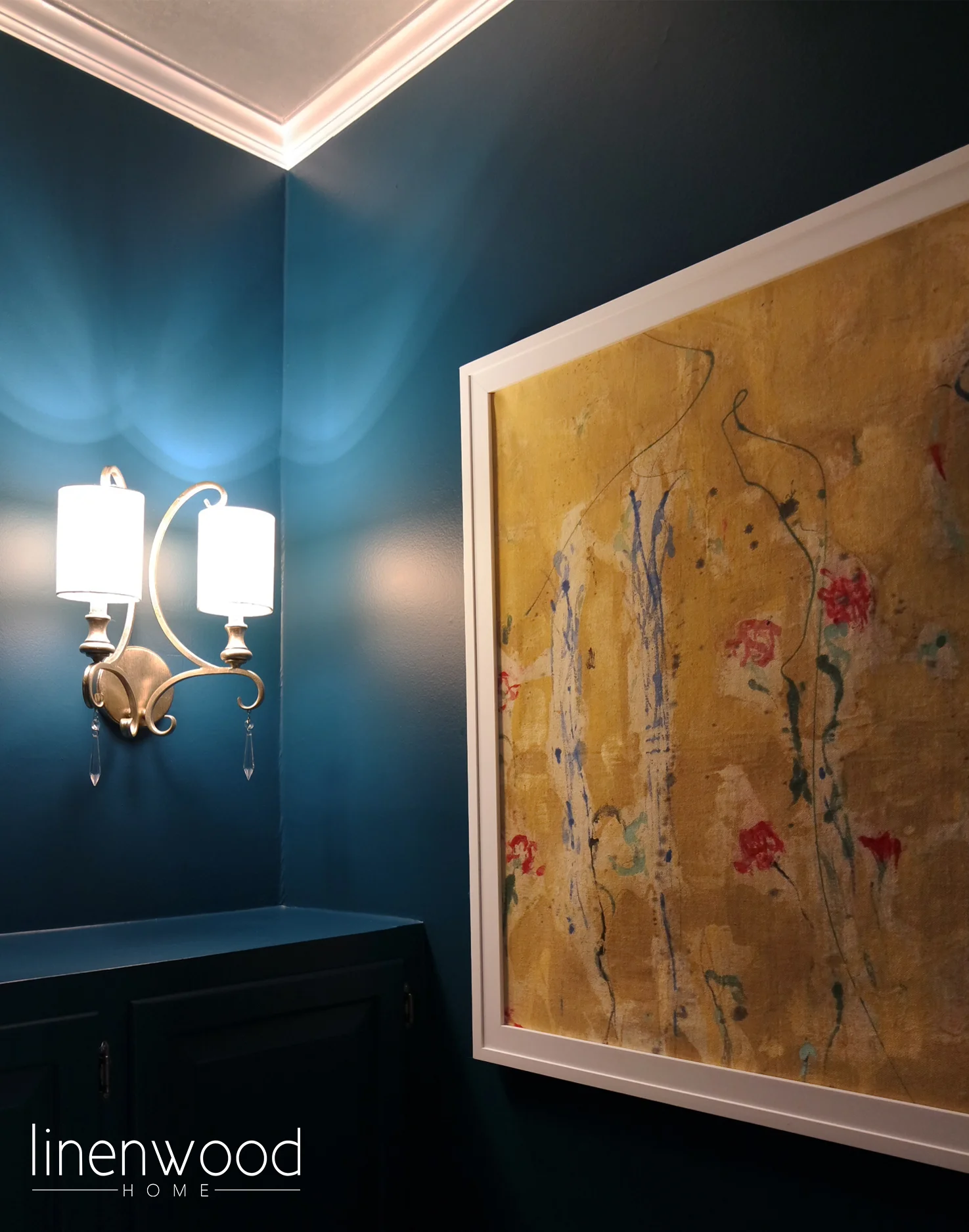 We were able to incorporate this beautiful abstract done by my client's uncle. It pulls the blue from the walls and the yellow contrasts nicely. To make the canvas more finished, we had it put in a simple white frame.
