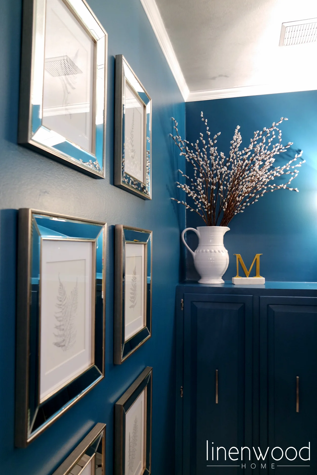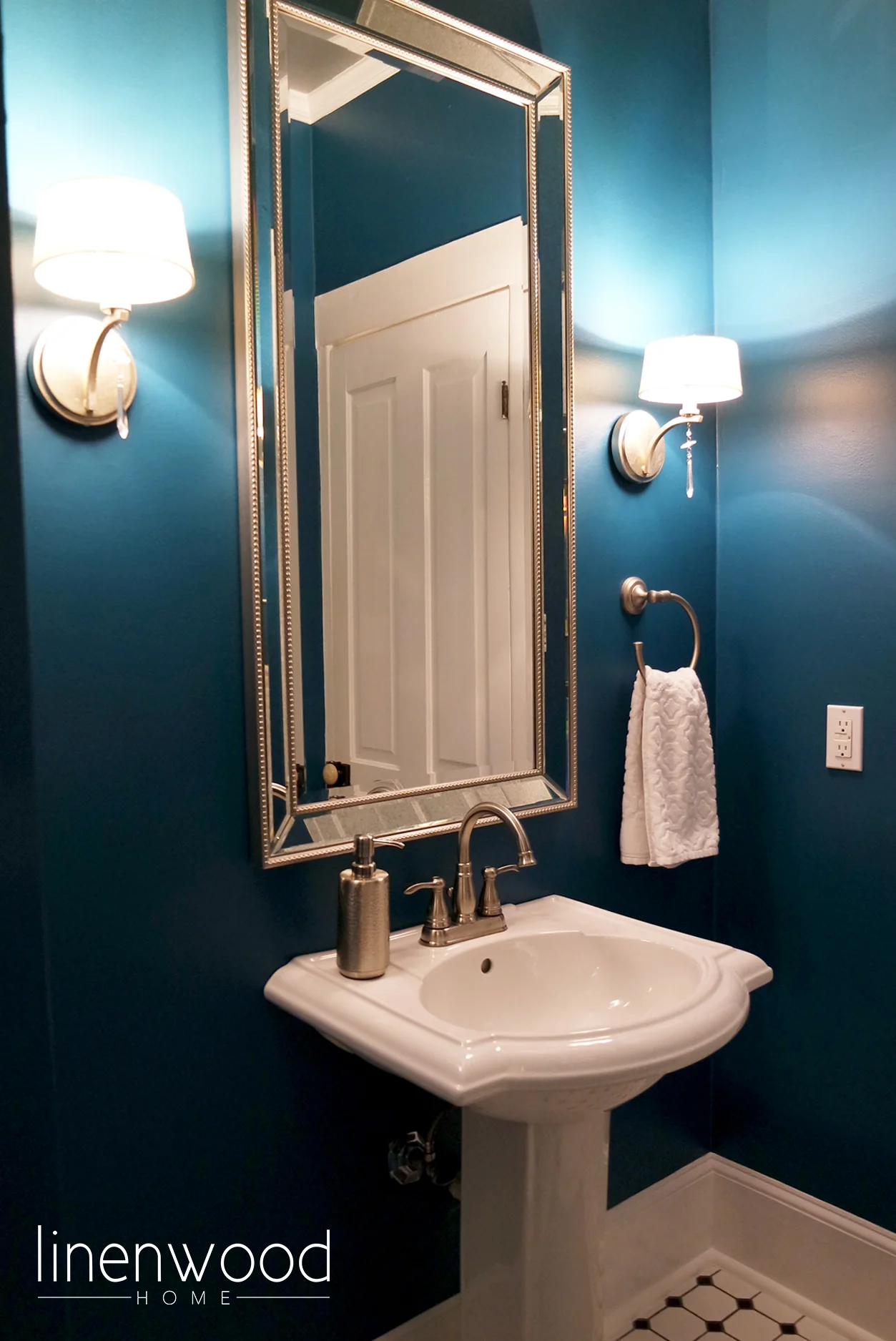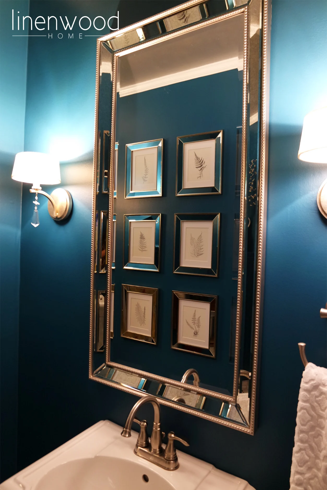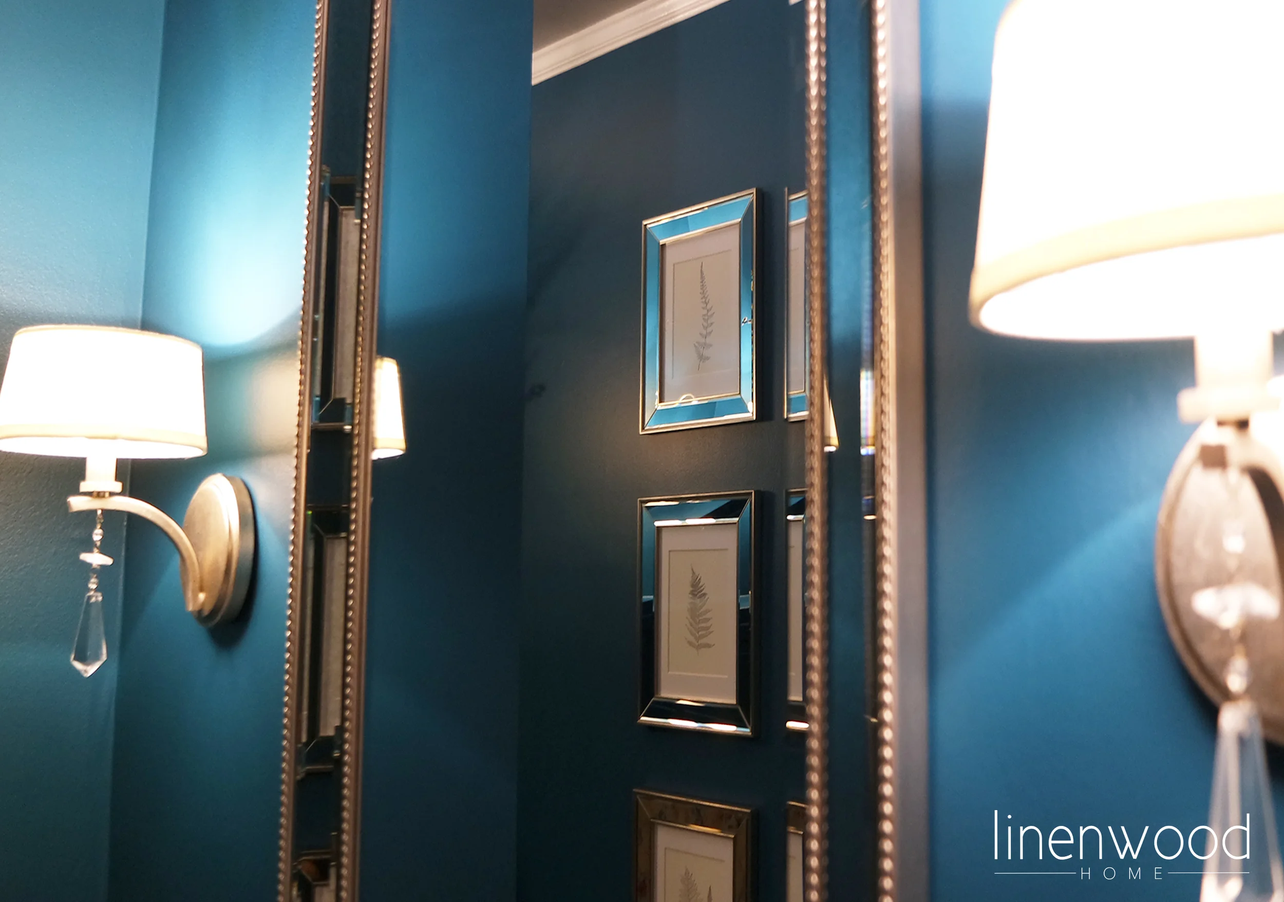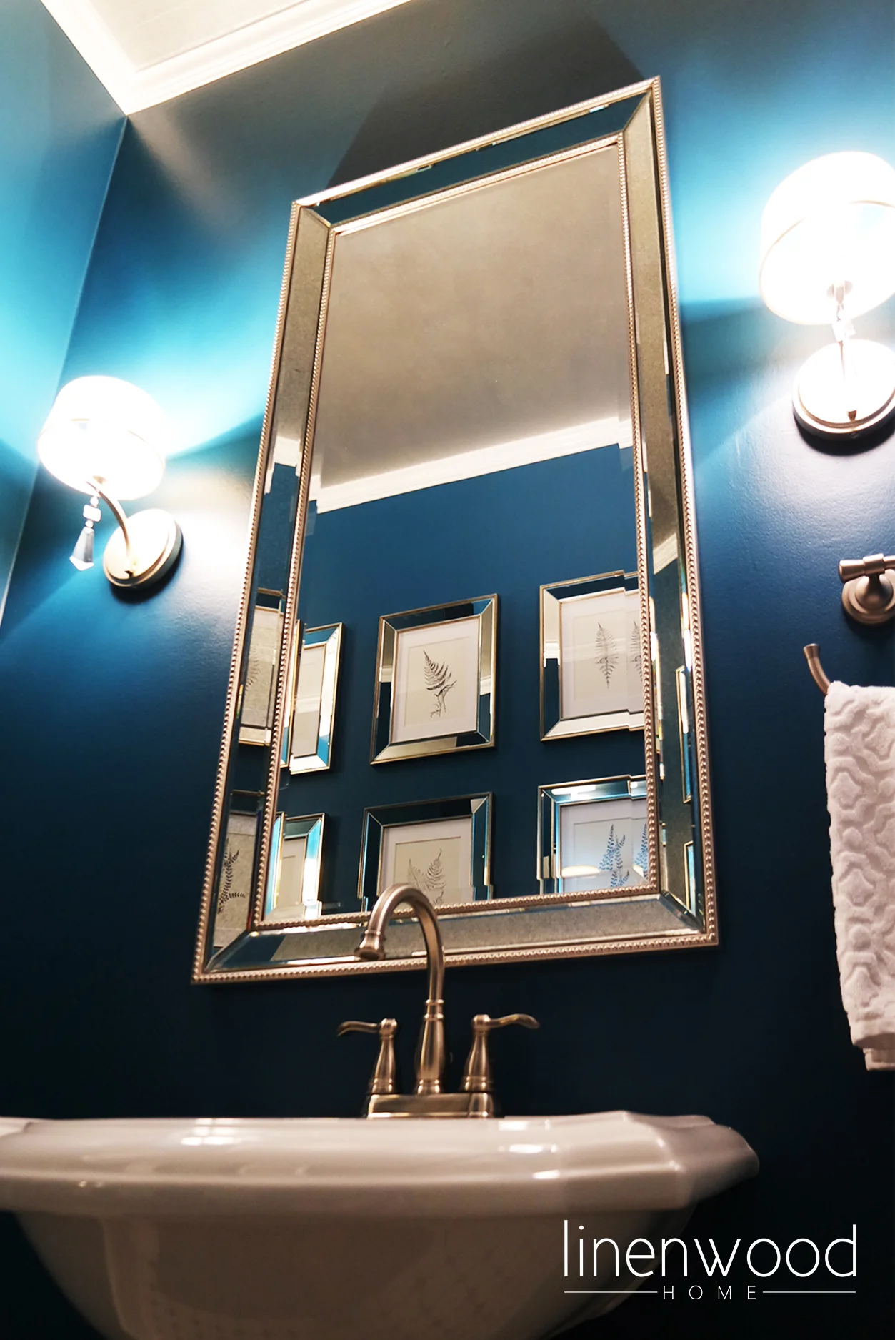 Sparkle, silver, sparkle, mirrors, and more sparkle. That's exactly what this powder room consists of, and it's just BEAUTIFUL!! The homeowner had already chosen the rich wall color, which is Benjamin Moore Pacific Ocean Blue. They also chose to paint the ceiling a metallic silver, which is perfect since there are no windows, and it helps reflect the light nicely.