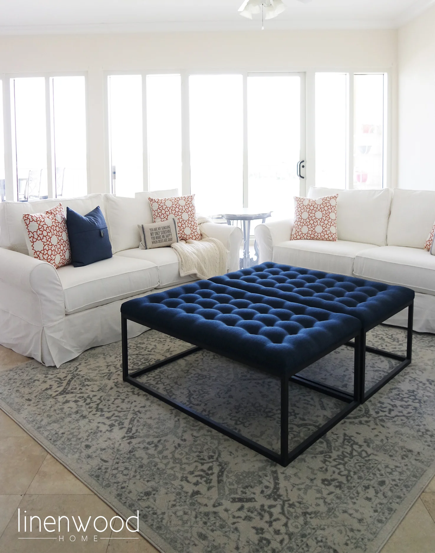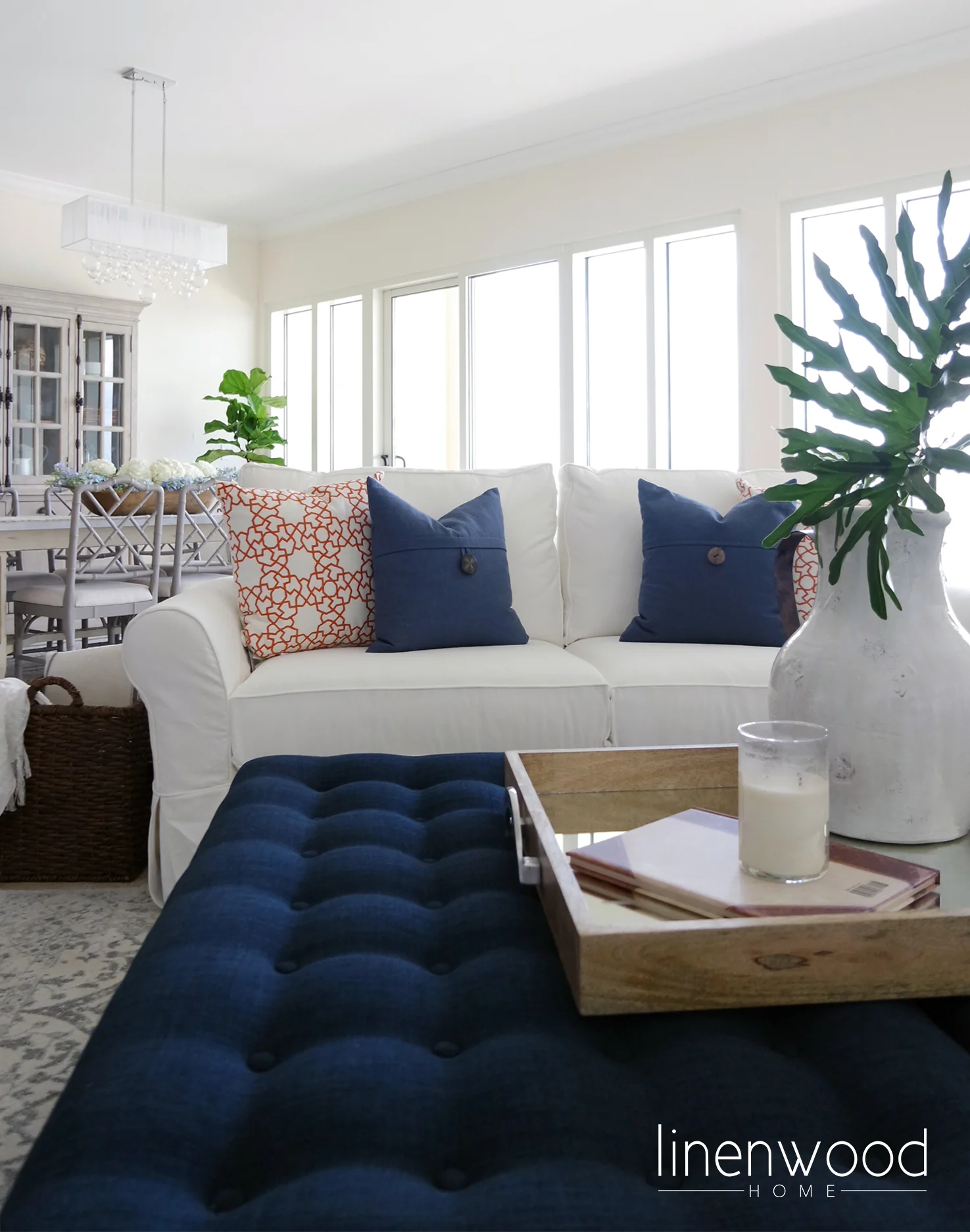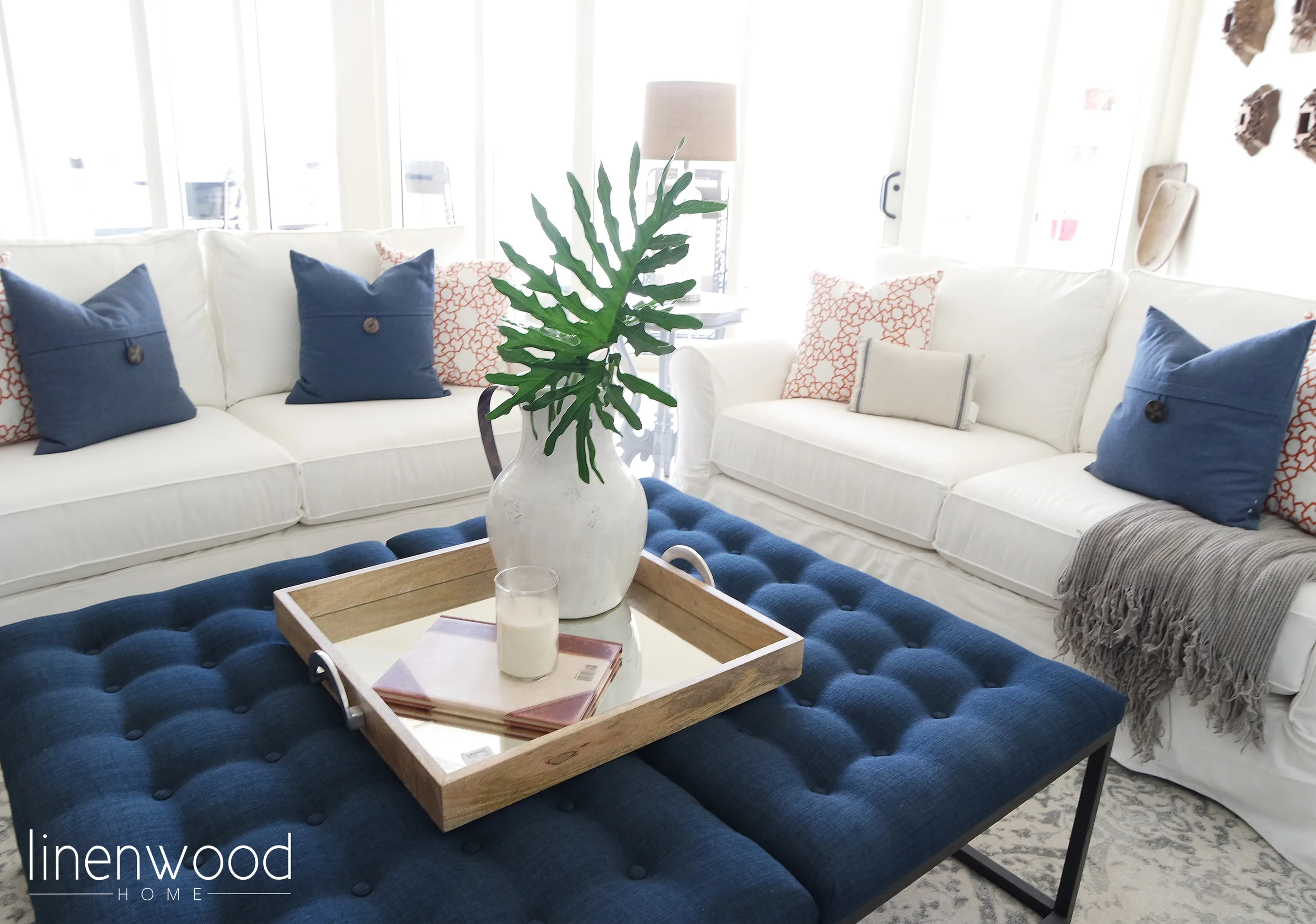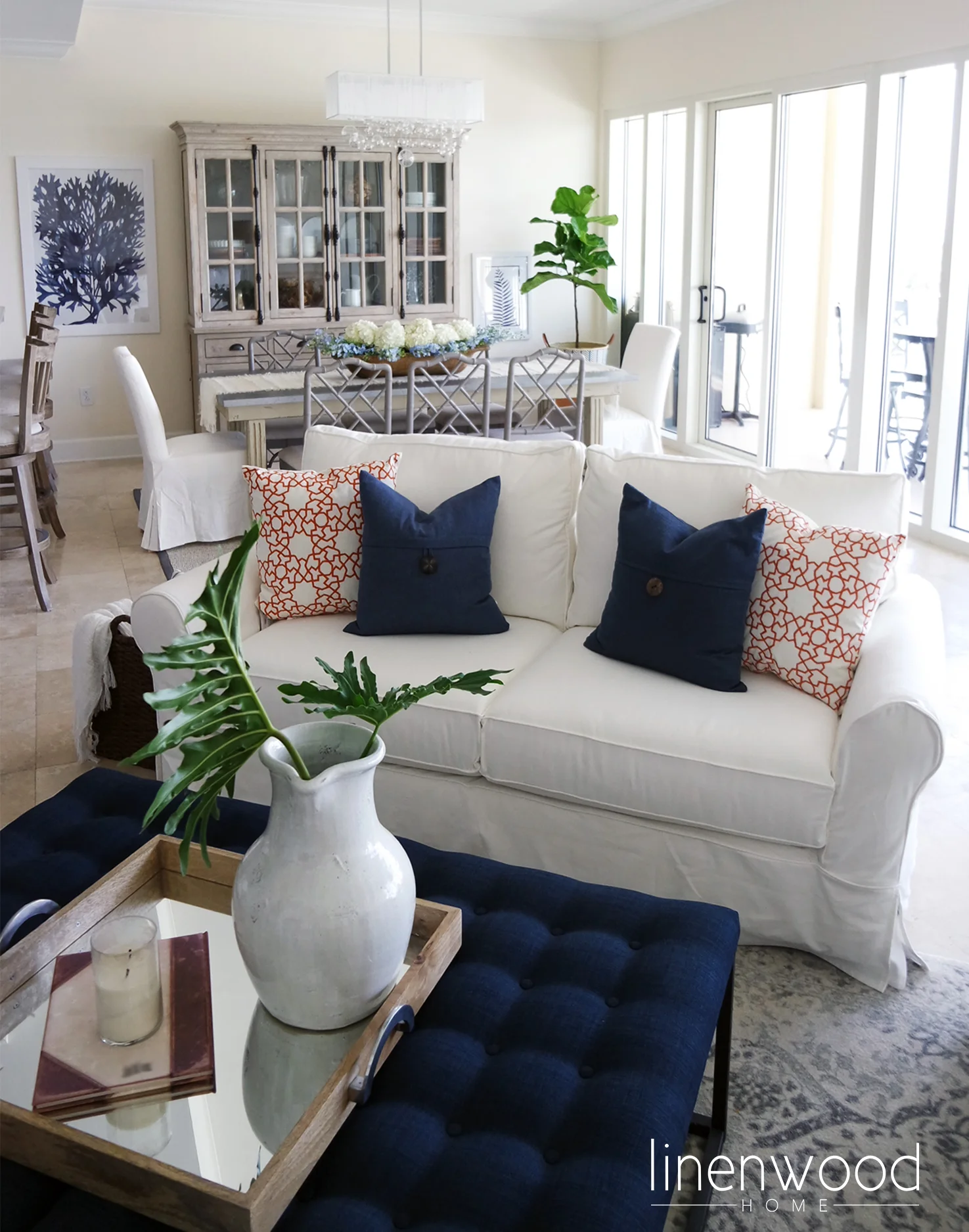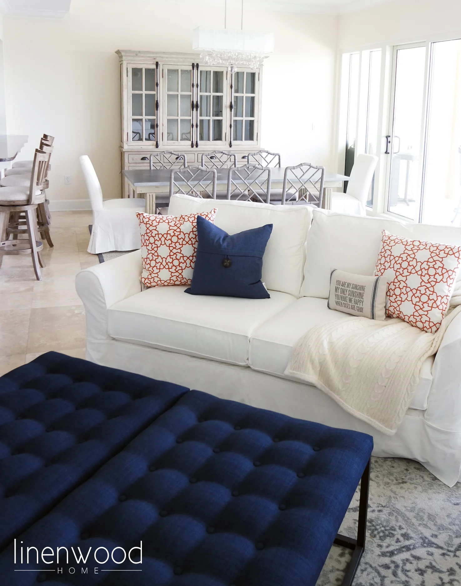 The living room is open to the dining room and kitchen, so we had to make sure everything worked nicely together. The dining room is what I'd like to call rustic elegance with a touch of coastal, and the bright and comfortable living room pops with accents of coral and navy. I am recently obsessed with the color navy blue. It's such a great neutral that goes with just about anything.