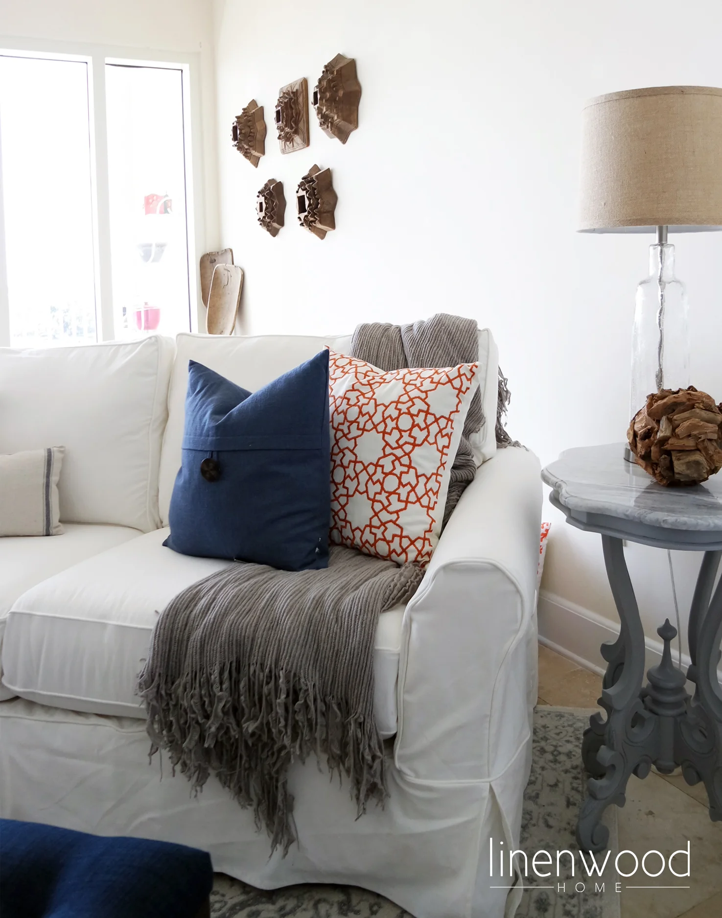 These couches are a staple if you have kids or grandkids. You can just throw the slipcovers in the wash! I'm a huge fan of anything slipcovered. They are also from Pottery Barn, along with the these awesome geometric coral accent pillows.