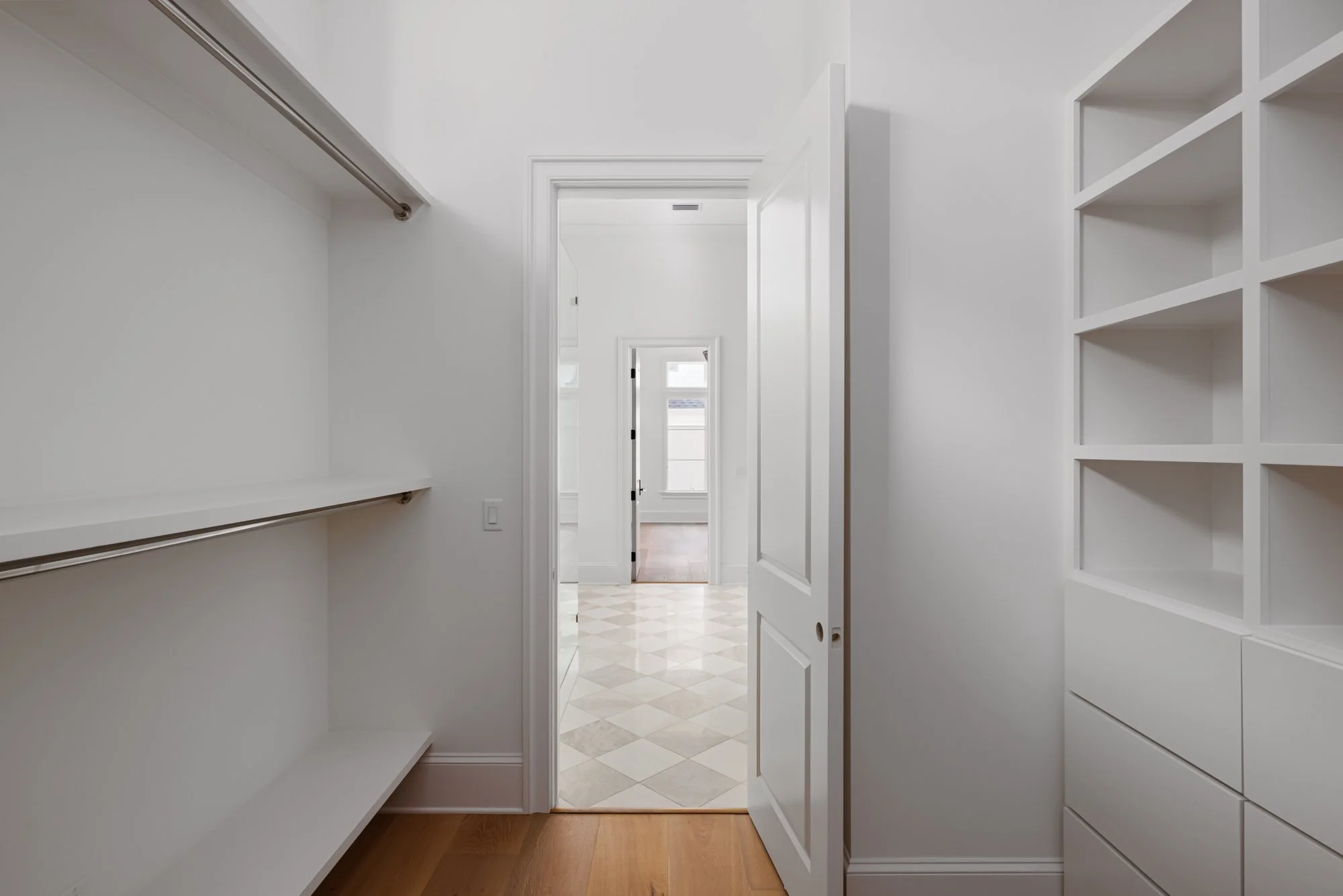 The entrance is a showstopper with the marble checkerboard flooring! By far my favorite flooring I have installed to date! This floor paired with the aged brass fixture really sets the tone for the home. The dining room has a gorgeous wallpapered ceiling paired with a circular shaded chandelier. We went outside of the ‘white everything’ norm these days, and did warmer tones in the kitchen - warm white perimeter cabinets and a walnut wood island. The showstopper in the kitchen is definitely the oversized zinc hood and the mercury glass pendants.